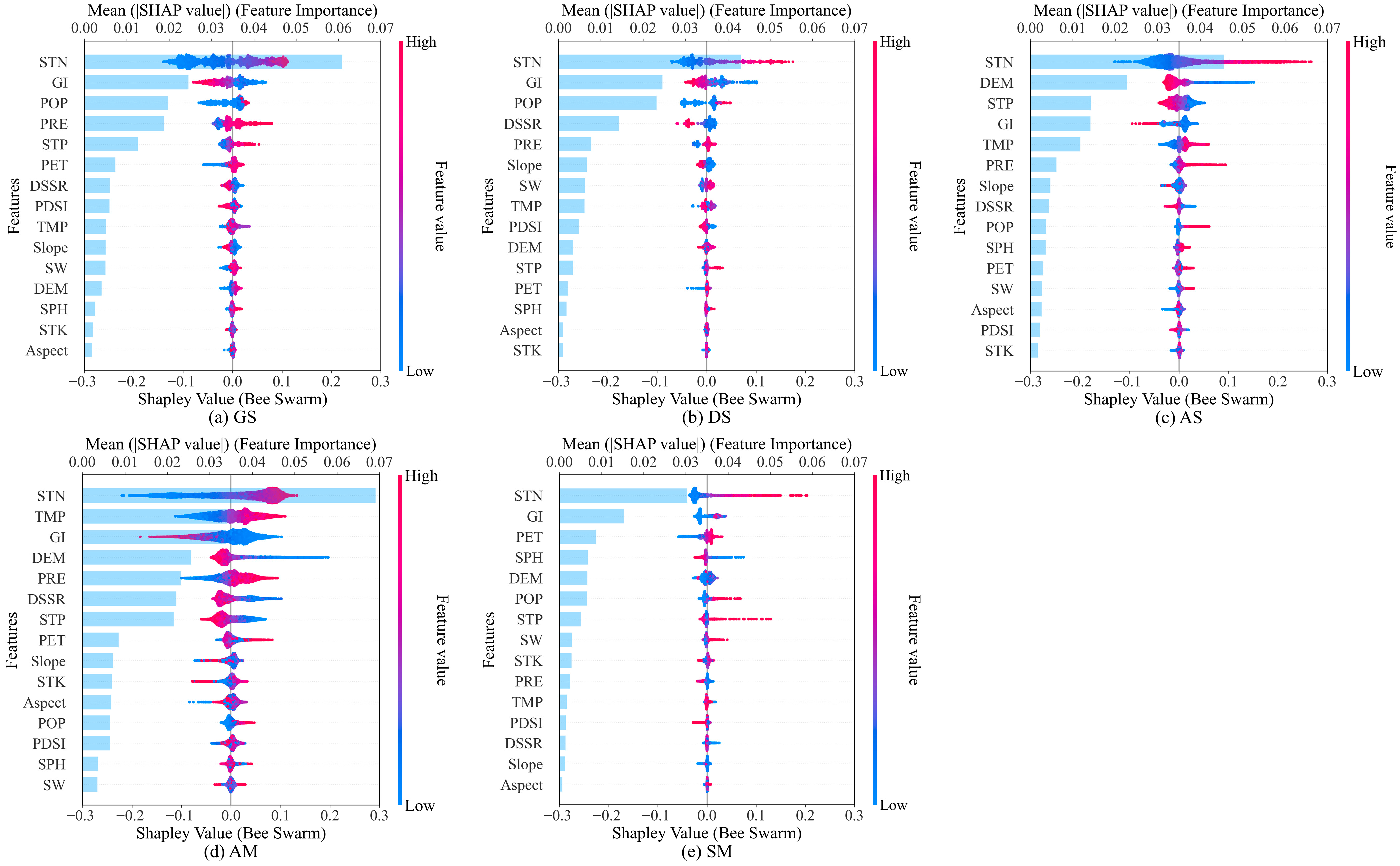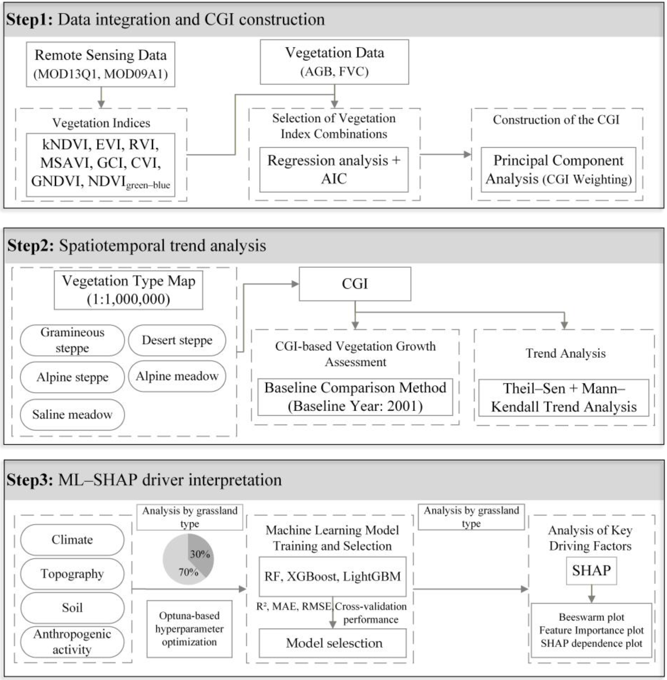 | Anthropogenic activity | Grazing intensity/GI | 250 m | Long-term High-resolution Grazing Intensity Dataset (yearly, 2001–2024), National Science and Technology Infrastructure of China (https://www.nesdc.org.cn/). |