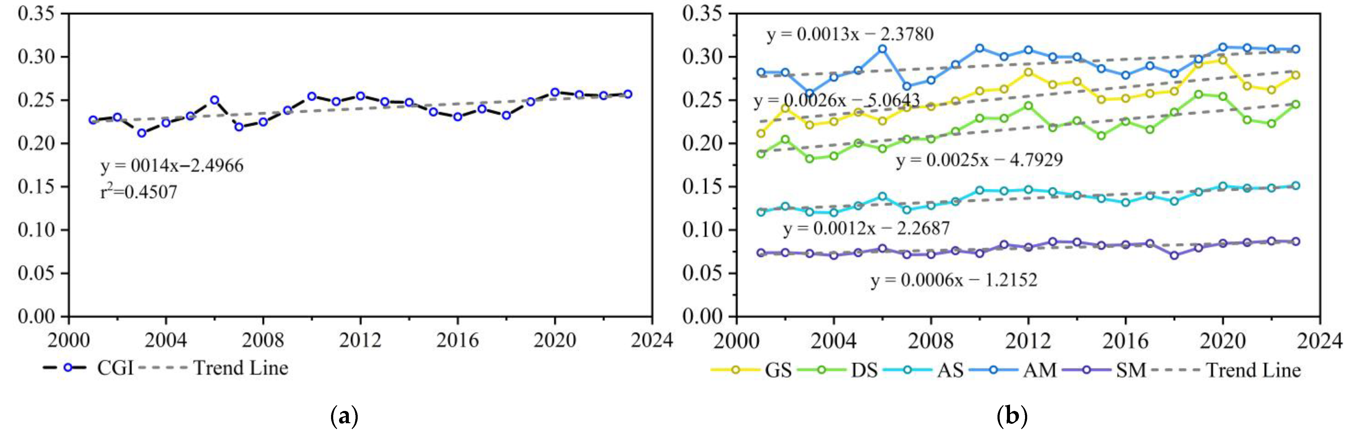 3.2. Spatiotemporal Dynamics and Trends of Alpine Grassland CGI