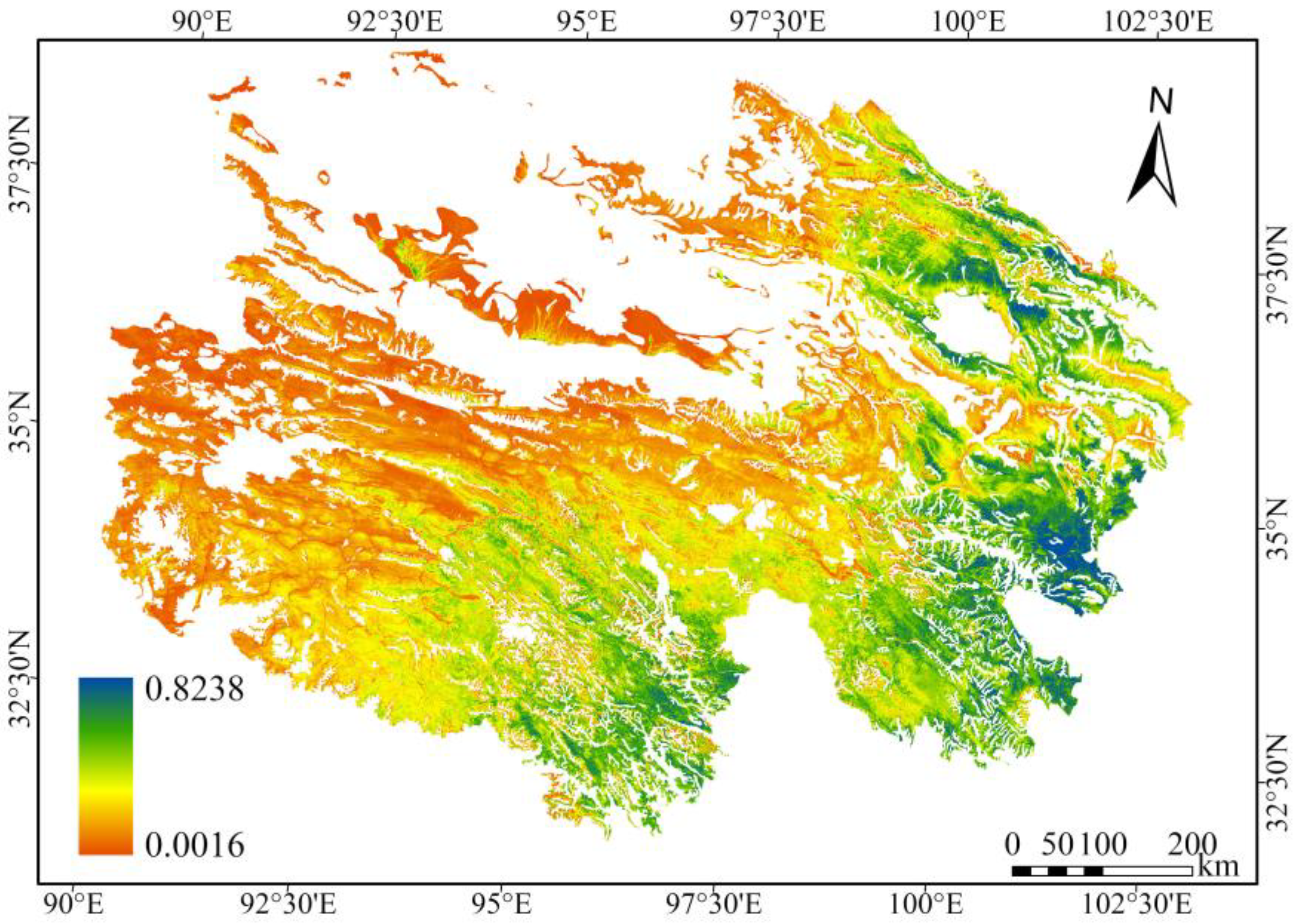 - Wang, S.; Dai, E.; Jia, L.; Wang, Y.; Huang, A.; Liao, L.; Cai, L.; Fan, D. Assessment of multiple factors and interactions affecting grassland degradation on the Tibetan Plateau. Ecol. Indic. 2023, 154, 110509. [Google Scholar] [CrossRef]