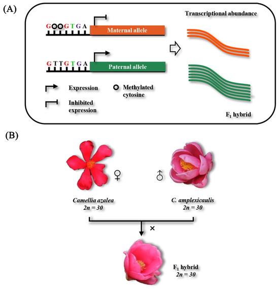 Scientific hypothesis and research materials of this study. (A) A basic model demonstrating allelic expression imbalance induced by allele-specific DNA methylation. In the figure, the maternal allele harbors species-specific cytosine sites; methylation at these sites represses its expression, ultimately causing allelic expression imbalance. Modified from Cleary and Seoighe [7] (B) Diagram showing the construction of the Camellia hybrid as well as materials used in this study.