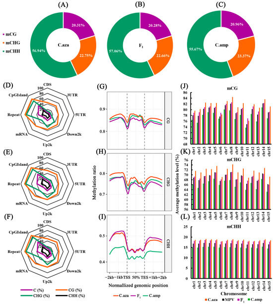 Whole-genome bisulfite sequencing identified 209.99 million, 167.17 million and 216.31 million methylated cytosines (mCs) from the male parent, female parent and F1 hybrid, respectively (Table 2). Among these, 20.28~20.96% were located in the CG context, while 22.66~23.37% and 55.68~57.06% in the CHG and CHH contexts (Figure 2A–C). Comparative analysis of methylation patterns across genomic contexts showed that CG, CHG, and CHH sites in all three samples exhibited maximal methylation enrichment in CpG islands and repetitive genomic regions. Specifically, CG sites displayed hypermethylation (>80%) in these regions, and CHG sites maintained consistently high methylation levels (>70%) (Figure 2D–F). In contrast, CHH methylation levels were markedly lower (18.23~24.85%) than those of CG and CHG contexts. Moreover, methylation patterns exhibited significant heterogeneity across distinct gene transcriptional elements (Figure 2G–I). Notably, upstream and downstream regions displayed higher methylation levels compared to the CDS (coding sequence) and UTR regions, regardless of cytosine context, and the patterns were roughly similar in all examined samples. Chromosome-wide analysis revealed that the F1 hybrids’ average methylation levels were intermediate between the two parental lines across most chromosomes. However, methylation levels of nearly all chromosomes in hybrids were higher than the mid-parent values (MPVs) in CG, CHG, and CHH contexts (Figure 2J–L).