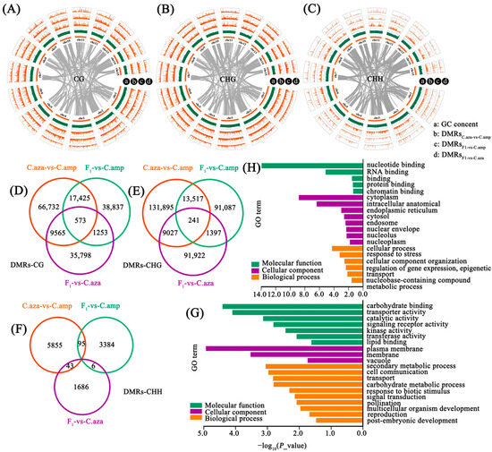 Differentially methylated regions between the parental lines and F1 hybrids. (A–C) Distribution of pairwise differentially methylated regions (DMRs) across the genome in CG (A), CHG (B), and CHH (C) contexts. (D–F) Venn diagram showing the number of DMRs shared by the pairwise comparison in CG (D), CHG (E), and CHH (F) contexts. (G) GO terms enriched from genes related to DMRs between F1 hybrids and the female parent in CG context. (H) GO terms enriched from genes related to DMRs between F1 hybrids and the male parent in CHG context. C.aza, Camellia azalea; C.amp, C. amplexicaulis; F1, F1 hybrids.