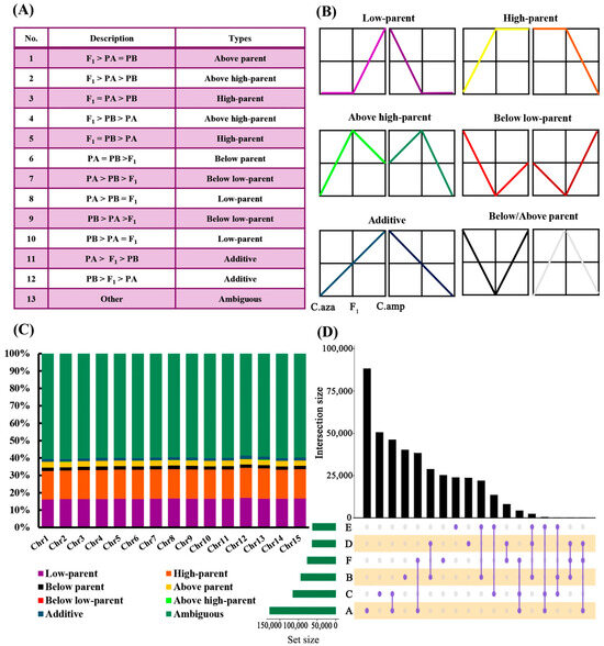 Fisher’s exact test was used to identify the pairwise differentially methylated sites (DMSs) between F1 hybrid and its parents. p-values were calculated based on the hypergeometric distribution, and a threshold of p < 0.01 was applied to identify significant DMSs. The pairwise DMSs were further categorized into eight groups (Figure 4A,B), as described by Chen et al. [45]. Specifically, DMSs with methylation levels intermediate between the two parents were classified as “Additive”. Non-additively methylated DMSs were subdivided into four groups when the parents exhibited different methylation levels: DMSs with methylation levels in the hybrid similar to those of the low-parental or high-parental value were classified as “Low-parent” or “High-parent”, respectively; DMSs with methylation levels in the hybrid higher than the high-parental or lower than the low-parental value were defined as “Above high-parent” and “Below low-parent”. When the methylation levels of the parents were equal, non-additively methylated DMSs were further classified into two groups: DMSs with methylation levels in the hybrid higher or lower than both parents were defined as “Above parent” or “Below parent”. Finally, DMSs that could not be clearly defined algorithmically were classified as “Ambiguous”.