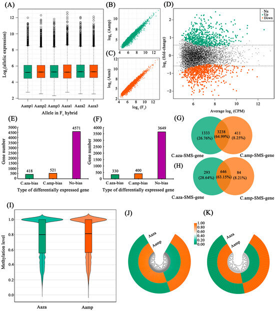 Diagrams showing the relationship between parent-specific methylation sites (PSMSs) and allelic expression imbalance (AEI). (A) Box plot showing the allelic expression after normalization. (B,C) Correlation between paternal (B) and maternal (C) monoallelic expression and F1 overall expression levels. (D) Volcano plot showing the divergent expression between the maternal and paternal alleles in F1 hybrids. NS, not significant. (E,F) Number of genes exhibiting parental bias in expression related to Camellia azalea-specific (E) and C. amplexicaulis-specific methylation sites (F) in F1 hybrids. C.aza-bias, genes showing biased expression toward the alleles from C. azalea; C. amp-bias, genes showing biased expression toward the alleles from C. amplexicaulis; No-bias, genes showing no parental bias in expression. (G,H) Venn diagram showing the number of genes co-regulated by C. azalea-specific and C. amplexicaulis-specific methylation sites within gene groups not exhibitin (G) or exhibiting (H) parental bias. C.aza-SMS-gene, genes regulated by C. azalea-specific methylation sites; C.amp-SMS-gene, genes regulated by C. amplexicaulis-specific methylation sites. (I) Distribution of mean allelic methylation levels of alleles simultaneously influenced by PSMSs. The methylation levels of parental alleles were assessed by calculating the mean methylation rate at PSMSs. Aaza, allele from C. azalea; Aamp, allele from C. amplexicaulis. (J,K) Heatmap showing the allelic expression of genes subject to maternally (J) and paternally (K) monoallelic methylation. Legend shows normalized gene expression levels. Orange, high expression; green, low expression; Aaza, allele from C. azalea; Aamp, allele from C. amplexicaulis.