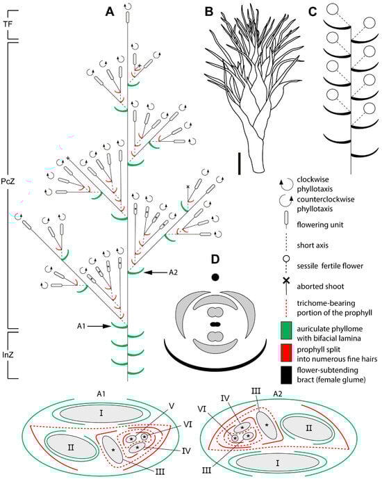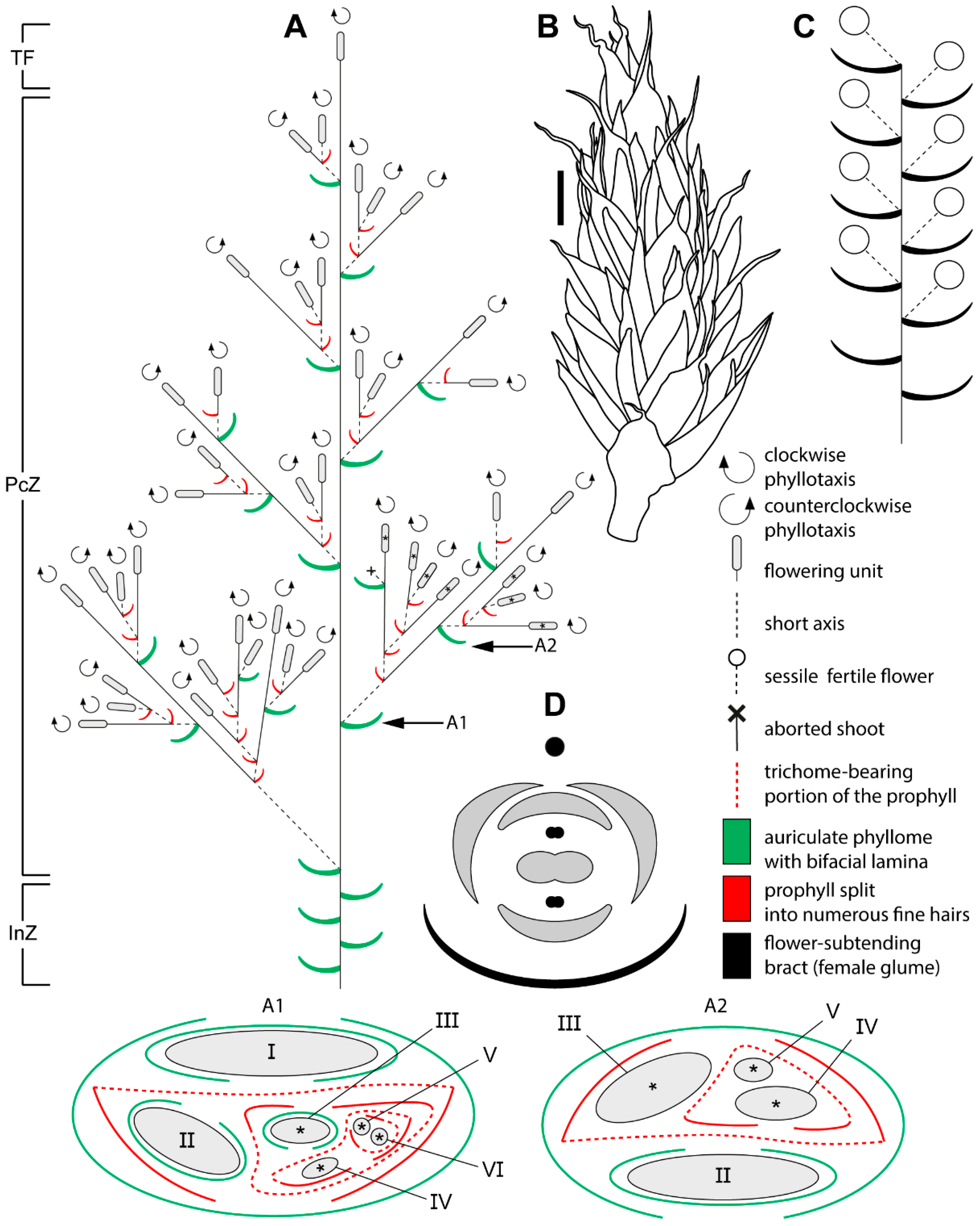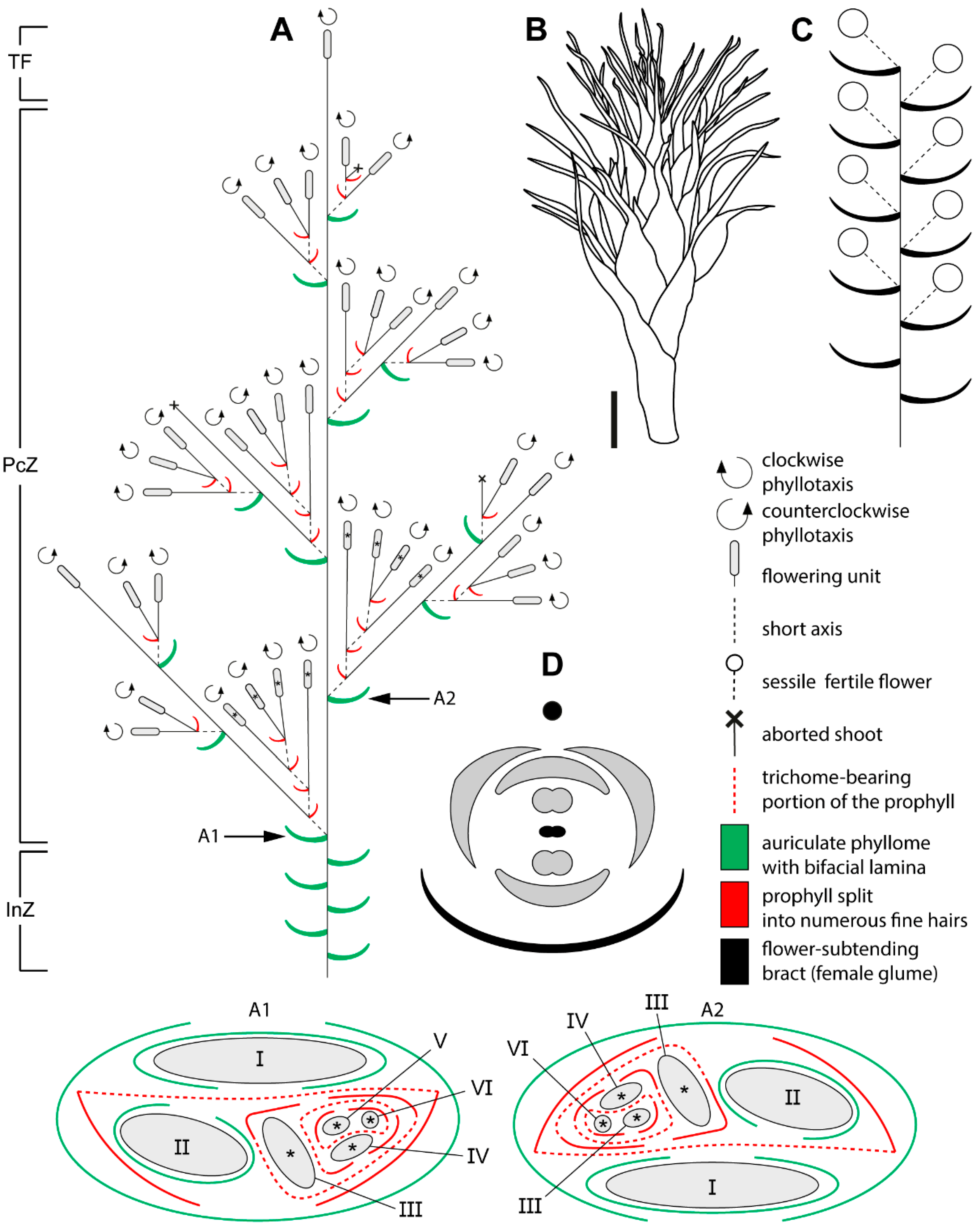 Figure 3. Schematic representation of the female synflorescence in Eurychorda complanata. (A) Overall synflorescence structure. Arrows indicate inflorescence modules illustrated in A1 and A2, with asterisks marking flowering units corresponding to those shown in the A1 and A2. Roman numerals indicate the branching order. (B) Habit of a female flowering unit. (C) Diagram of the female flowering unit. Note that the actual number of flowers is much higher than illustrated here. (D) Diagram of the female flower. The black circle represents the spikelet axis, and the black phyllome denotes the flower-subtending bract (female glume). InZ, inhibition zone; PcZ, paraclade zone; TF, terminal flowering unit. Scale bar: 1 mm (B).