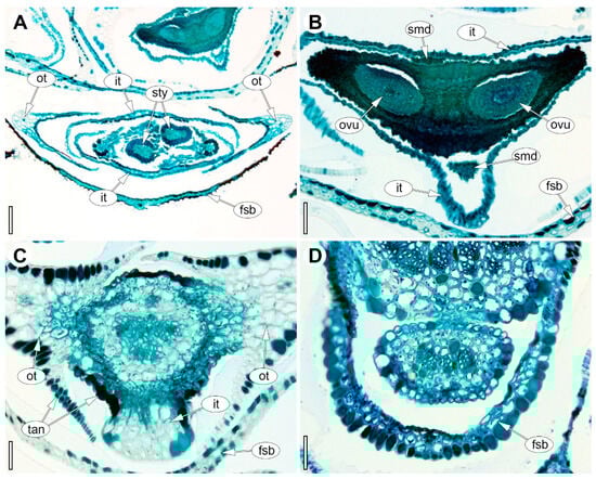 Figure 7. Anatomy of the female flower of Eurychorda complanata in transverse sections arranged from apex to base. (A) Asymplicate zone with two stylodia. (B) Synascidiate zone of the dimerous gynoecium. (C) Basal region of the receptacle showing the onset of delimitation of the two outer tepals. (D) Floral base prior to perianth delimitation. fsb, flower-subtending bract; it, inner tepal; ot, outer tepal; ovu, ovule; smd, staminode; sty, stylodium; tan, tannins. Scale bars: 100 µm (A), 50 µm (BD).