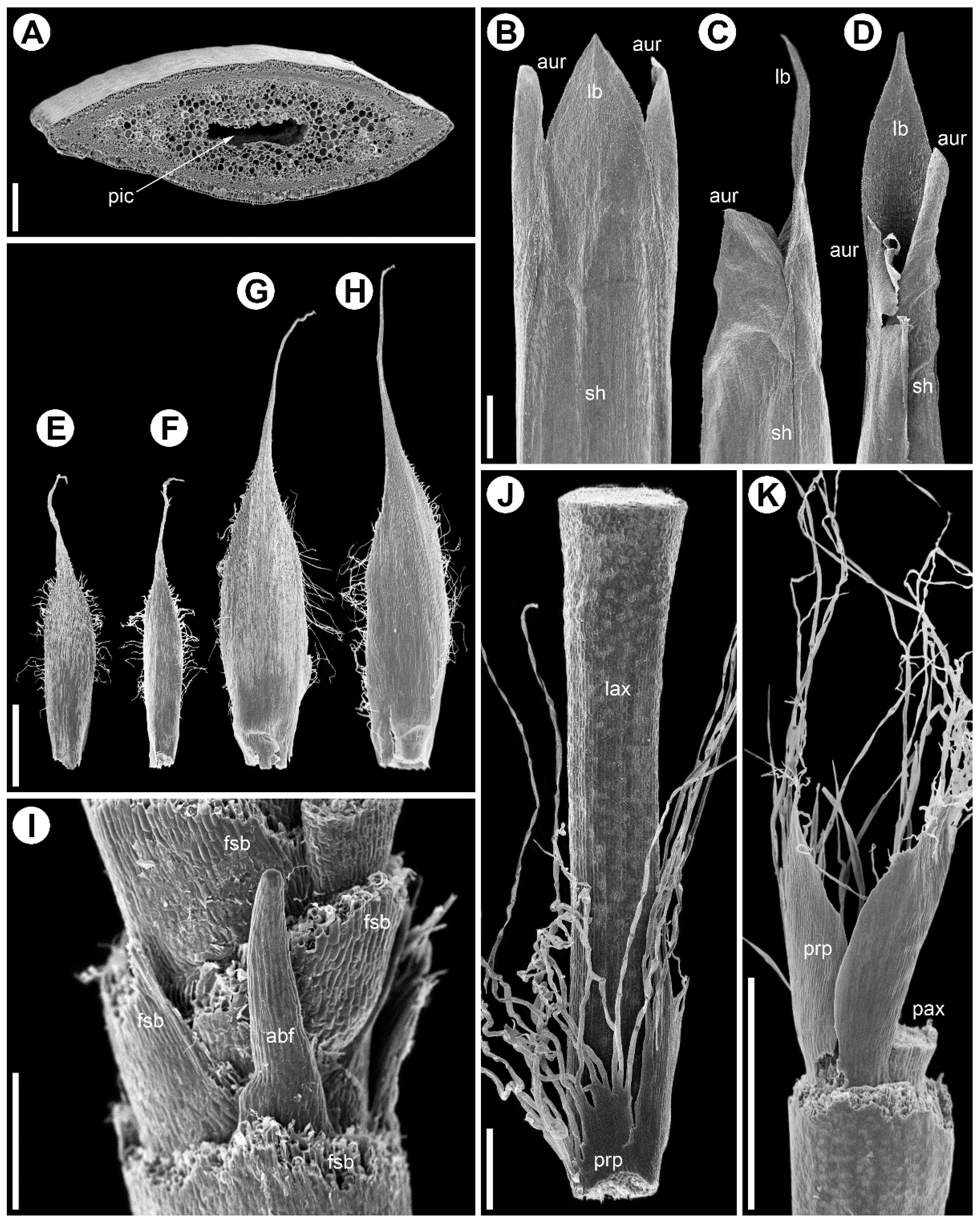 Figure 4. Stem and leaf morphology in Eurychorda complanata (SEM). Female (AD,GK) and male (E,F) plants; (A) internode cross-section; (BD) vegetative leaves from the inhibition zone (similar leaves occur along the synflorescence main axis up to the apex and at basal paraclade nodes, except at prophyll-bearing nodes). (B) Abaxial view, (C) lateral view, and (D) adaxial view. (EH) Flower-subtending bracts of male (E,F) and female (G,H) flowers. (E,G) Abaxial side, (F,H) adaxial side. (I) Base of a female spikelet with partly removed bracts showing an aborted flower. (J,K) Prophyll split into numerous fine hairs, viewed from the parent-axis side (J) and away from it (H). abf, aborted flower; aur, auricle; fsb, flower-subtending bract; lb, leaf blade; lax, lateral axis; pax, parent axis; pic, pith cavity; prp, prophyll; sh, sheath. Scale bars; 200 µm (A); 1 mm (BH,K), 300 µm (I,J).