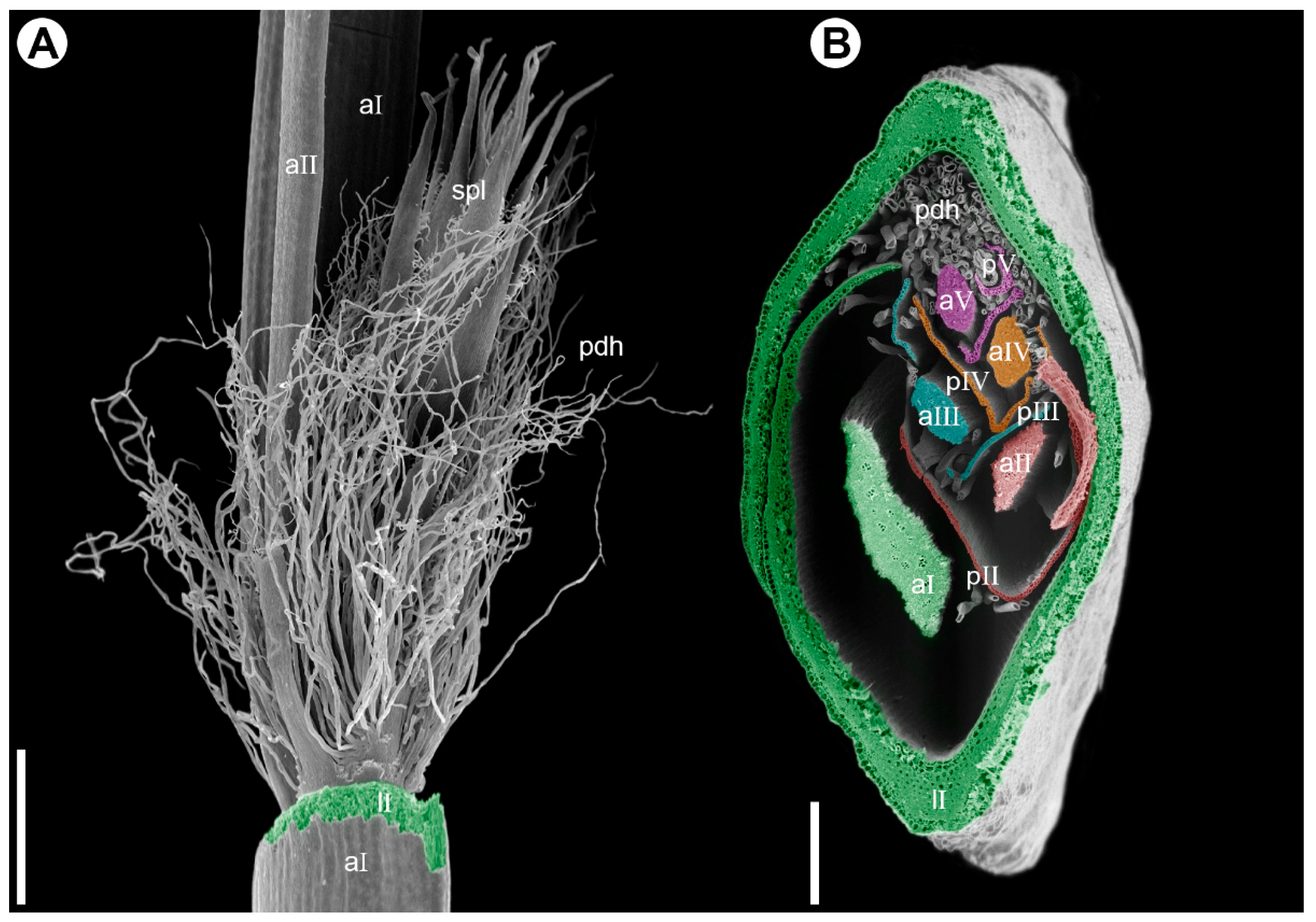 Figure 5. Branching pattern in synflorescence of Eurychorda complanata (SEM). (A) Portion of the male synflorescence main axis with its leaf removed to show the base of the paraclade. The first-order paraclade terminates in a spikelet (not shown) and bears a second-order paraclade, which also terminates in a spikelet. Hypopodium (the portion of stem below the prophyll) is short in all paraclades, and the middle portion of the prophyll is split into numerous fine hairs. (B) Cross-section of the female synflorescence main axis showing the branching pattern. Axes and their leaves are artificially colored: first order, green; second order, red; third order, turquoise; fourth order, orange; fifth order, magenta. aI–aV, axes of subsequent branching orders; lI, leaf on the first-order axis; pII–pV, prophylls of subsequent lateral axes; pdh, prophyll-derived hairs; spl, spikelet. Scale bars: 1 mm (A), 300 µm (B).