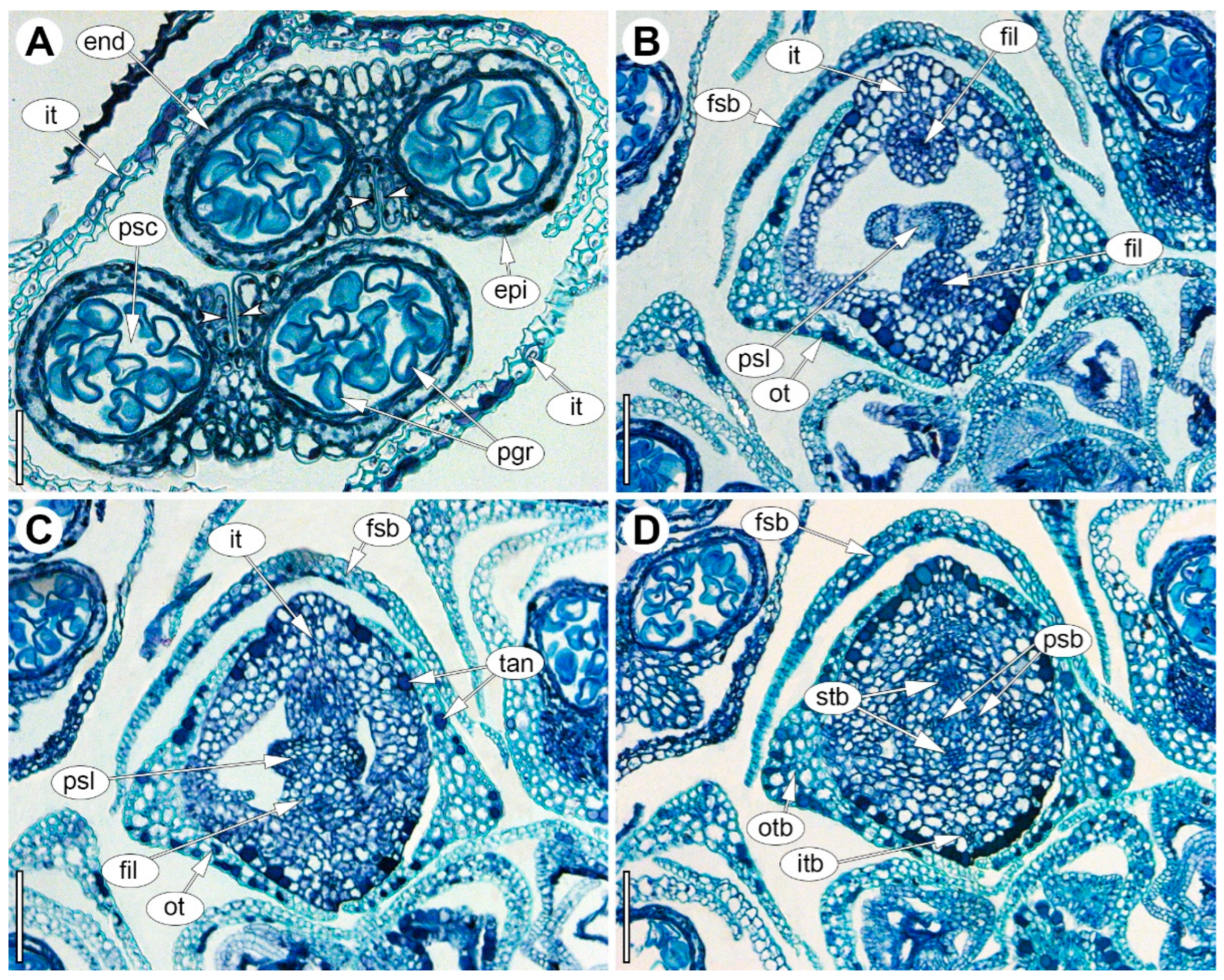 Figure 6. Anatomy of the male flower of Eurychorda complanata in transverse sections arranged from apex to base. (A) Section of the androecium at a level above the connective, showing two bisporangiate anthers. (B) Basal part of the androecium with two stamen filaments opposite the inner tepals and a dimerous pistillode at the flower center. (C) Separation of the androecium with two stamen filaments from the pistillode. (D) Upper part of the receptacle; delimitation of the inner tepals. end, endothecium; epi, epidermis; fil, filament; fsb, flower-subtending bract; it, inner tepal; itb, inner tepal bundle; ot, outer tepal; otb, outer tepal bundle; pgr, pollen grain; psb, pistillode bundle; psc, pollen sac; psl, pistillode; stb, stamen bundle; tan, tannins. Arrowheads indicate the longitudinal slit of anther dehiscence. Scale bars: 50 µm (A), 100 µm (BD).