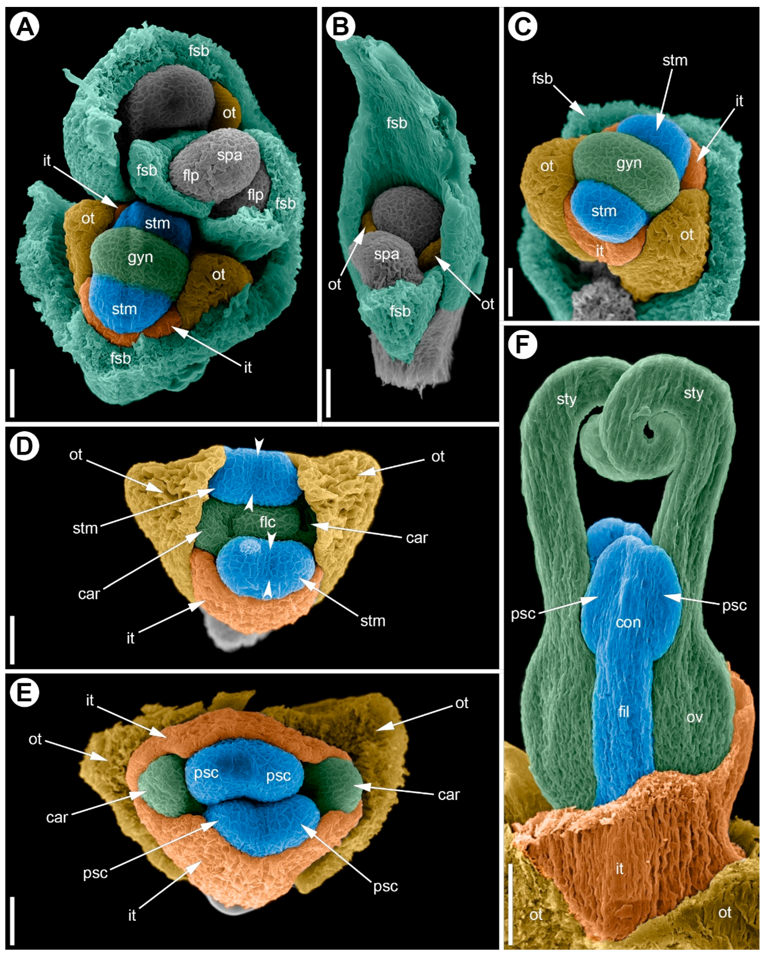Figure 9. Development of the female flower of Eurychorda complanata (SEM). (A) Top view of the female spikelet showing the onset of floral primordium delimitation from the inflorescence apex. (B) Flower at the stage of delimitation of the two outer tepals. (C) Flower with the perianth delimited; staminodes are initiated opposite the inner tepals; the gynoecium is at early ridge stage. (D) Top view of a flower with two initiated carpels. (E) Top view of a female flower in which, at this stage, the staminodes still outgrow the carpels and meet above them, closing the floral center; the carpel tips remain visible. (F) Stages of longitudinal growth of the asymplicate zone of the gynoecium; carpel tips are spiral-coiled. Arrowheads indicate the boundaries of the longitudinal furrow separating the pollen sacs. car, carpel; con, connective; fil, filament; flp, floral primordium; fsb, flower-subtending bract; gyn, gynoecium; it, inner tepal; ot, outer tepal; ov, ovary; psc, pollen sac; spa, spikelet apex; stm, stamen; sty, stylodium. Scale bars: 30 µm (AE), 100 µm (F).