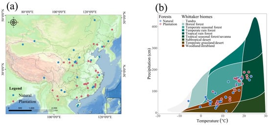 Spatial distribution of natural forests and plantation forests and their climatic conditions within Chinese regions: (a) Spatial distribution of NPP (g C/m2 year) in natural forests and plantation forests; (b) Distribution of Whittaker climate types for different forest types.