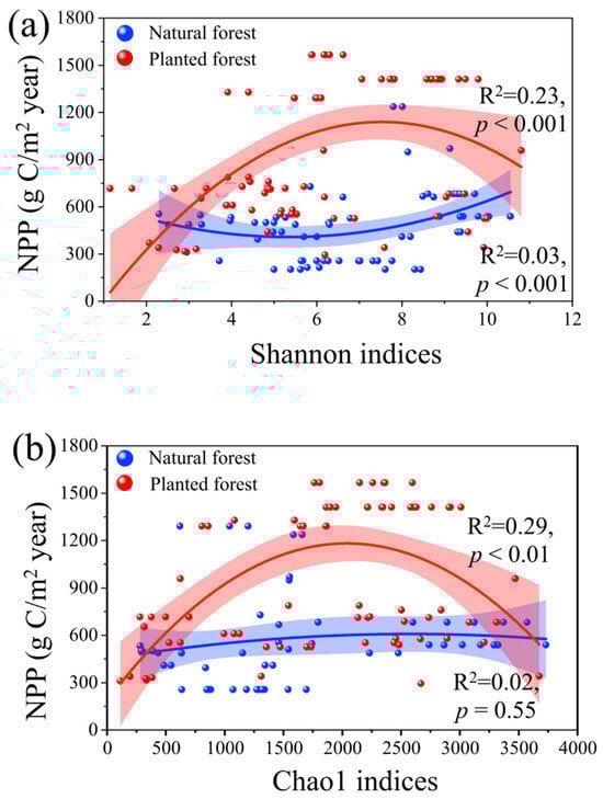 (a) Comparison of the relationship between Shannon indices with NPP (g C/m2 year) in natural and plantation forests; (b) Comparison of the relationship between Chao1 indices with NPP (g C/m2 year) in natural forests and plantation forests. p < 0.01 indicates significant differences.