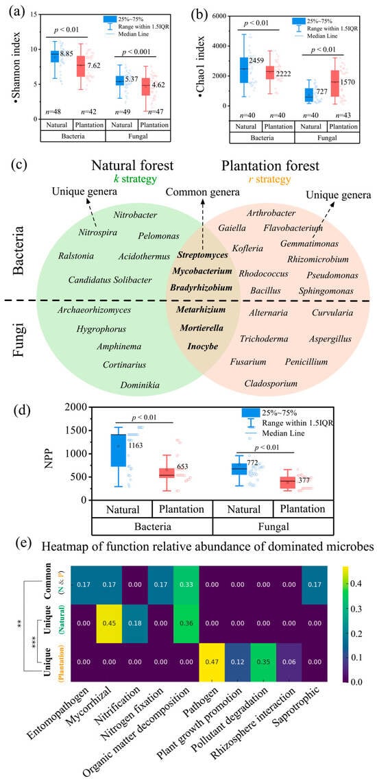 Comparison of (a) bacterial and fungal Shannon indices and (b) Chao1 indices between natural forests and plantation forests. n represents the sample size. (c) Venn diagram comparing dominant bacterial and fungal genera between natural forests (left) and plantation forests (right), with overlapping regions representing taxa common to both systems. Distinct microbial genera reflect ecosystem-specific functional traits linked to nutrient cycling and stress adaptation. (d) Comparison of NPP between natural forests and plantation forests in the bacterial dataset and the fungal dataset, respectively. (e) Heatmap of the relative functional abundance of dominant microbial communities. The first row illustrates the relative abundance of genera shared between both forest types, the second row highlights dominant genera exclusive to natural forests, and the third row features dominant genera unique to plantation forests.