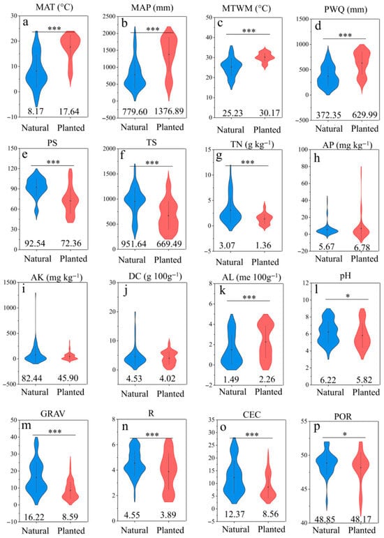 Comparison of the climatic and soil factors between natural forests and planted forests. Climatic factors include: (a) Mean Annual Temperature (MAT), (b) Annual Precipitation (MAP), (c) Max Temperature of Warmest Month (MTWM), (d) Precipitation of Wettest Quarter (PWQ), (e) Precipitation Seasonality (PS), (f) Temperature Seasonality (TS), Soil nutrient factors include: (g) Total Nitrogen (TN), (h) Available P (AP), (i) Available K (AK), (j) Dry Color (DC), (k) Exchangeable Al (AL), (l) Soil pH (pH), (m) Soil Particles (GRAV), (n) Root Abundance (R), (o) Cation Exchange Capacity (CEC), (p) Porosity (POR). The importance of these variables was estimated by the percentage increase in the Mean Squared Error (MSE, %). * indicates the significance level (*** p < 0.001; * p < 0.05). The value at the bottom indicates the mean value.