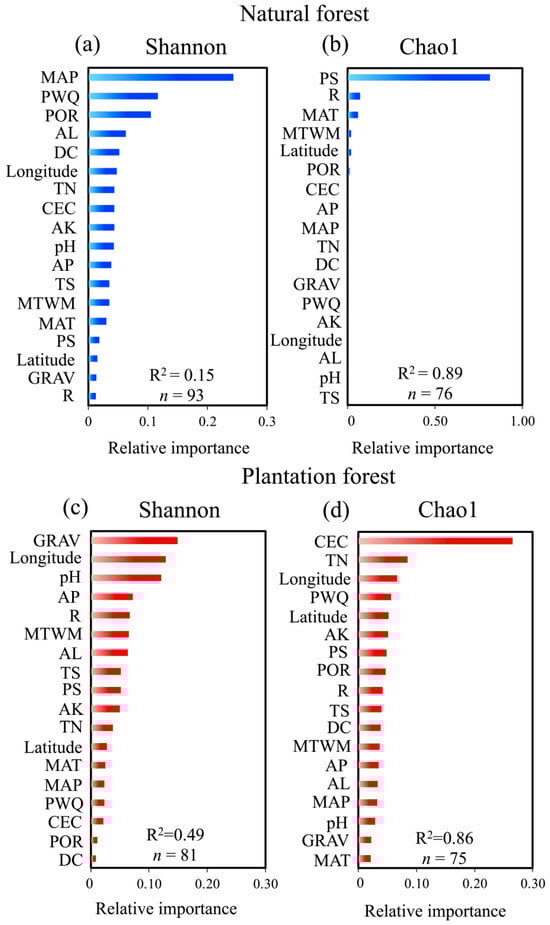 In contrast, plantation forest exhibited higher model performance for both diversity metrics. The Shannon index was best predicted by GRAV, longitude, and pH (Figure 5c). For the Chao1 index in plantation forest, CEC emerged as the dominant predictor, followed by TN and latitude (Figure 5d), underscoring the importance of nutrient buffering capacity and large-scale climatic proxies in shaping species richness under anthropogenic management regimes. These contrasting patterns highlight that microbial diversity in natural forests is more strongly regulated by climatic and biotic feedbacks, whereas plantation forests are primarily shaped by soil nutrient status and management-related edaphic factors. This divergence suggests that conservation strategies in natural forests should prioritize the protection of hydrological and plant-microbe interactions, while soil amelioration (e.g., enhancing CEC and nutrient balance) may be more effective for boosting microbial richness in plantation ecosystems.