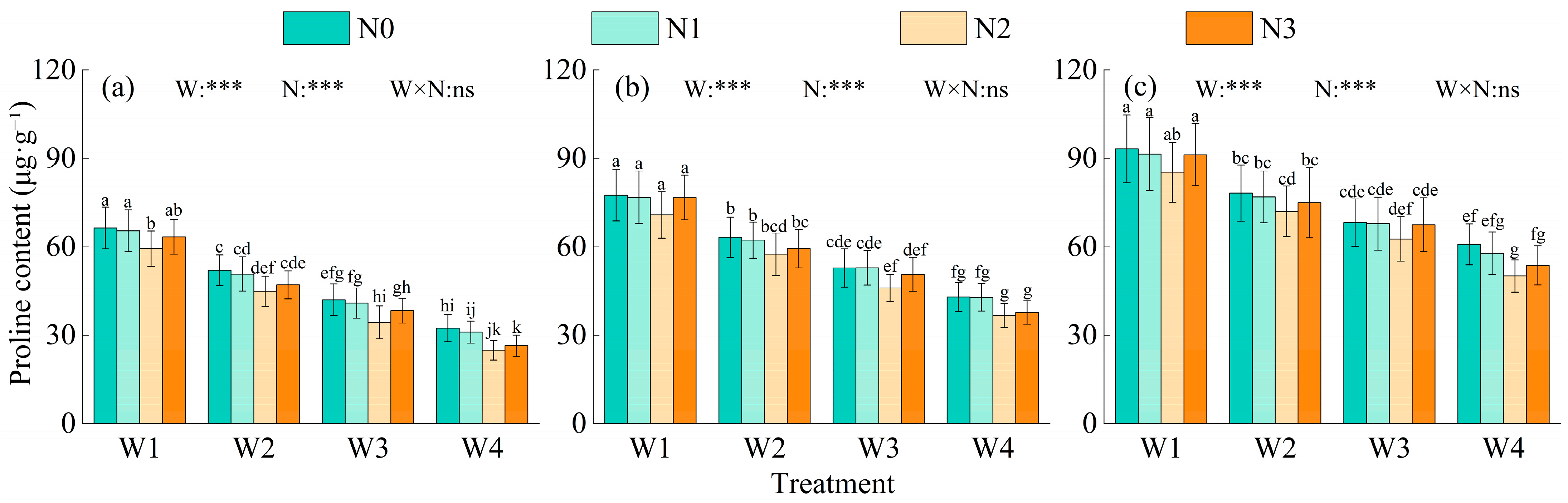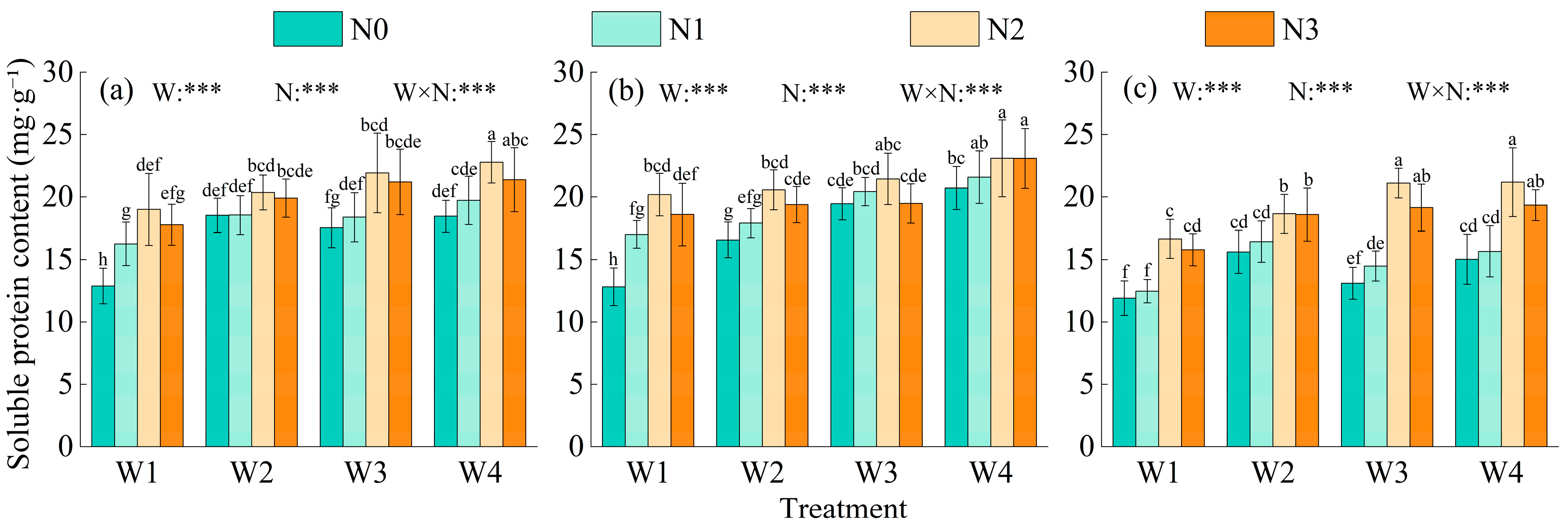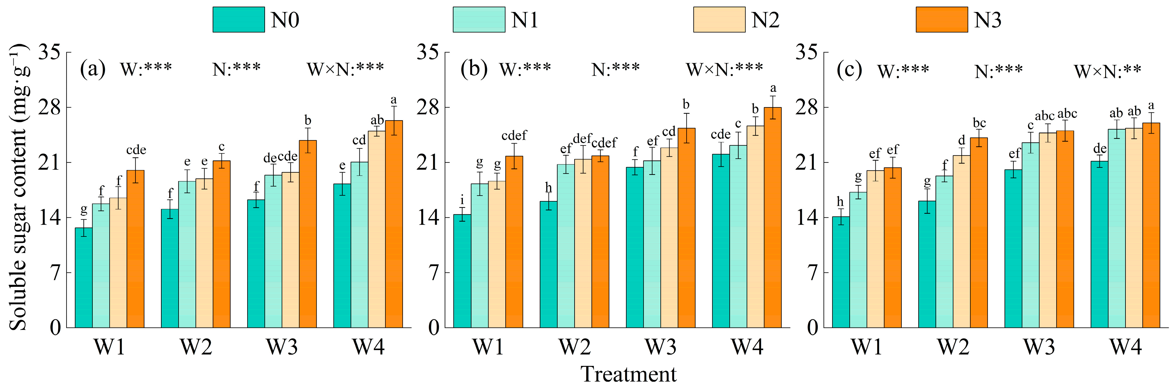 - Under drought conditions, Pro content markedly increased, whereas sufficient water supply significantly enhanced SP and SS accumulation. Regarding nitrogen response, Pro reached the lowest level at N2, SP peaked at N2, and SS continuously increased with nitrogen input, indicating a differentiated regulation pattern.