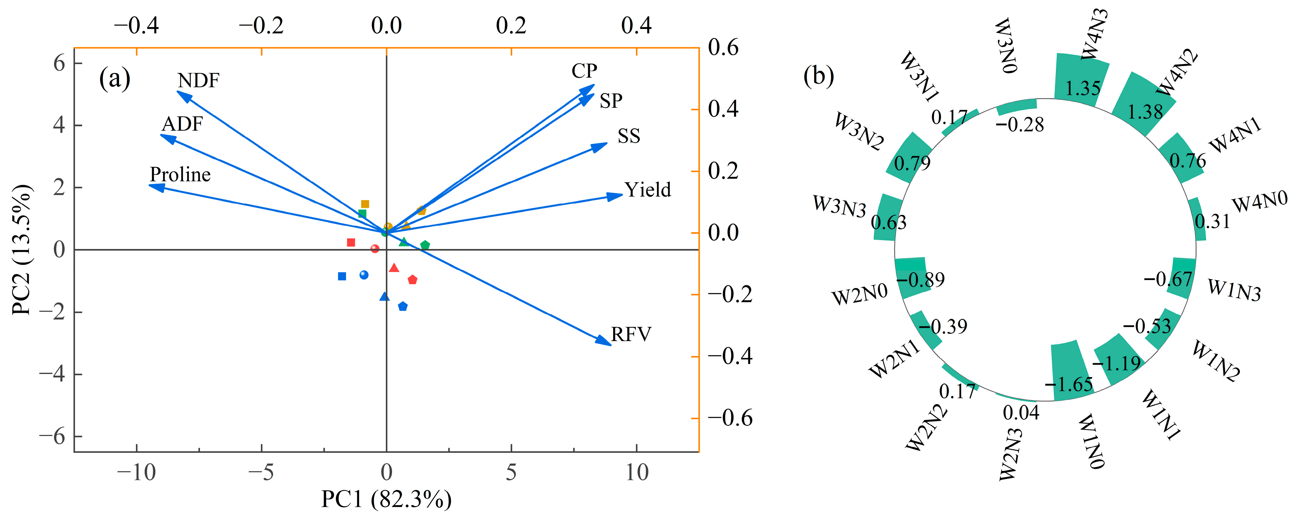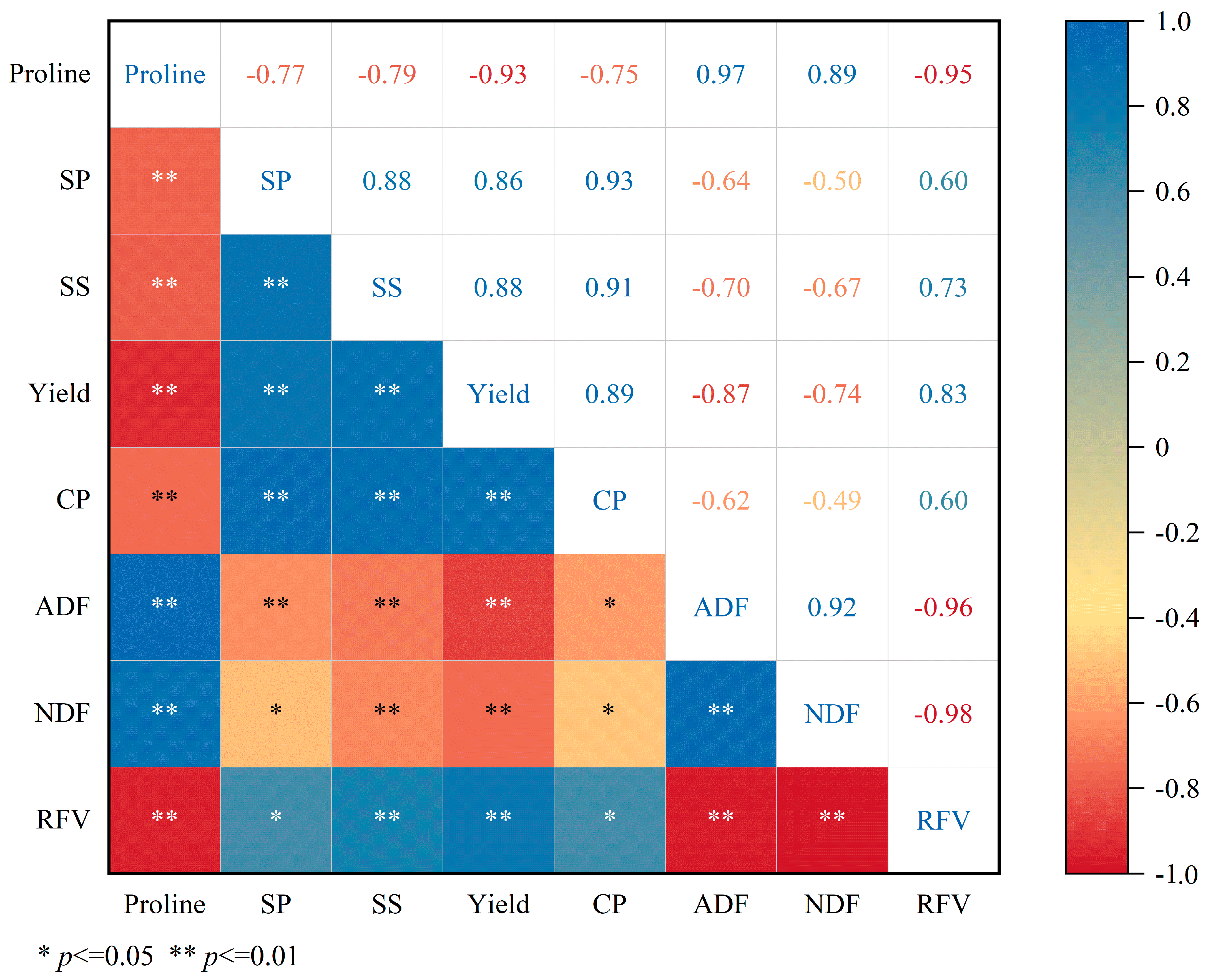 - Correlation and PCA analyses revealed that Pro was significantly positively correlated with ADF and NDF but negatively correlated with yield, CP, and RFV. In contrast, SP and SS showed significant positive correlations with yield, CP, and RFV.