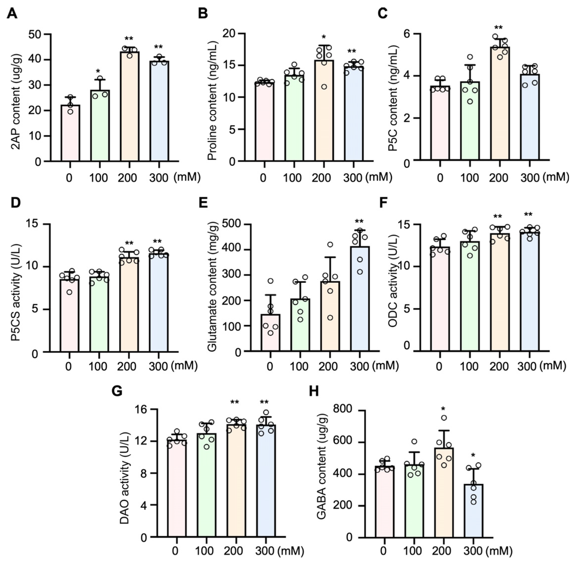 - Huang, S.; Deng, Q.; Zhao, Y.; Chen, C.; Geng, A.; Wang, X. L-glutamate seed priming enhances 2-acetyl-1-pyrroline formation in fragrant rice seedlings in response to arsenite stress. J. Agric. Food Chem. 2023, 71, 18443–18453. [Google Scholar] [CrossRef] [PubMed]