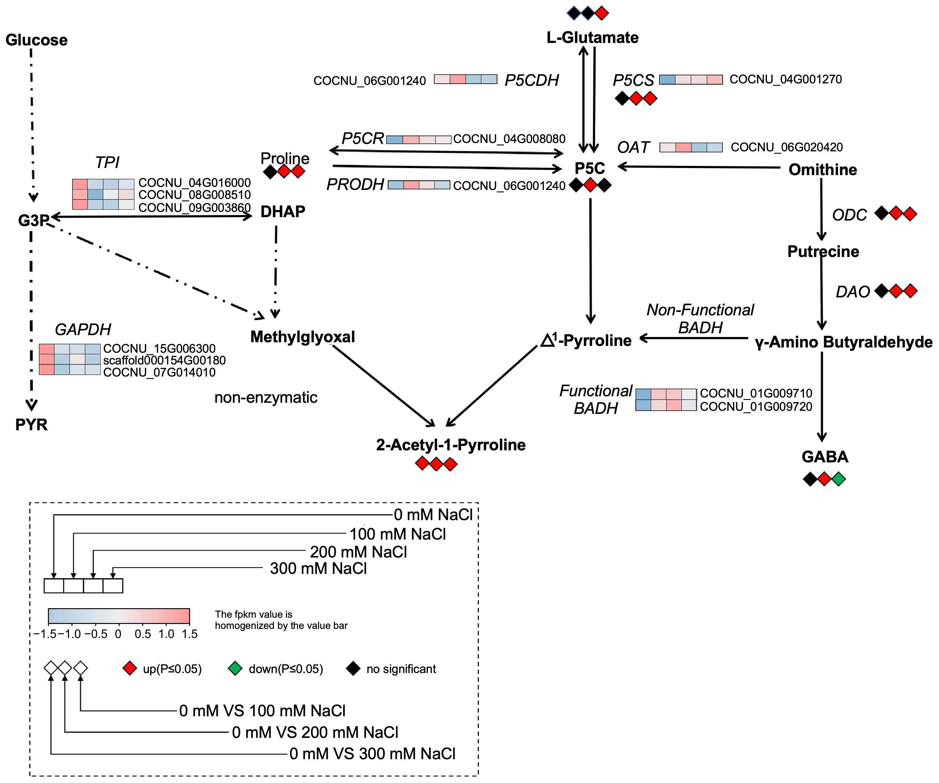 APA StyleYin, J., Luo, D., Shi, C., Ding, H., Li, J., Sun, X., Shen, X., Liu, X., Iqbal, A., & Yang, Y. (2026). Salt Stress Enhances Aroma Component 2-Acetyl-1-Pyrroline in Aromatic Coconut (Cocos nucifera Linn.). Plants, 15(2), 174. https://doi.org/10.3390/plants15020174