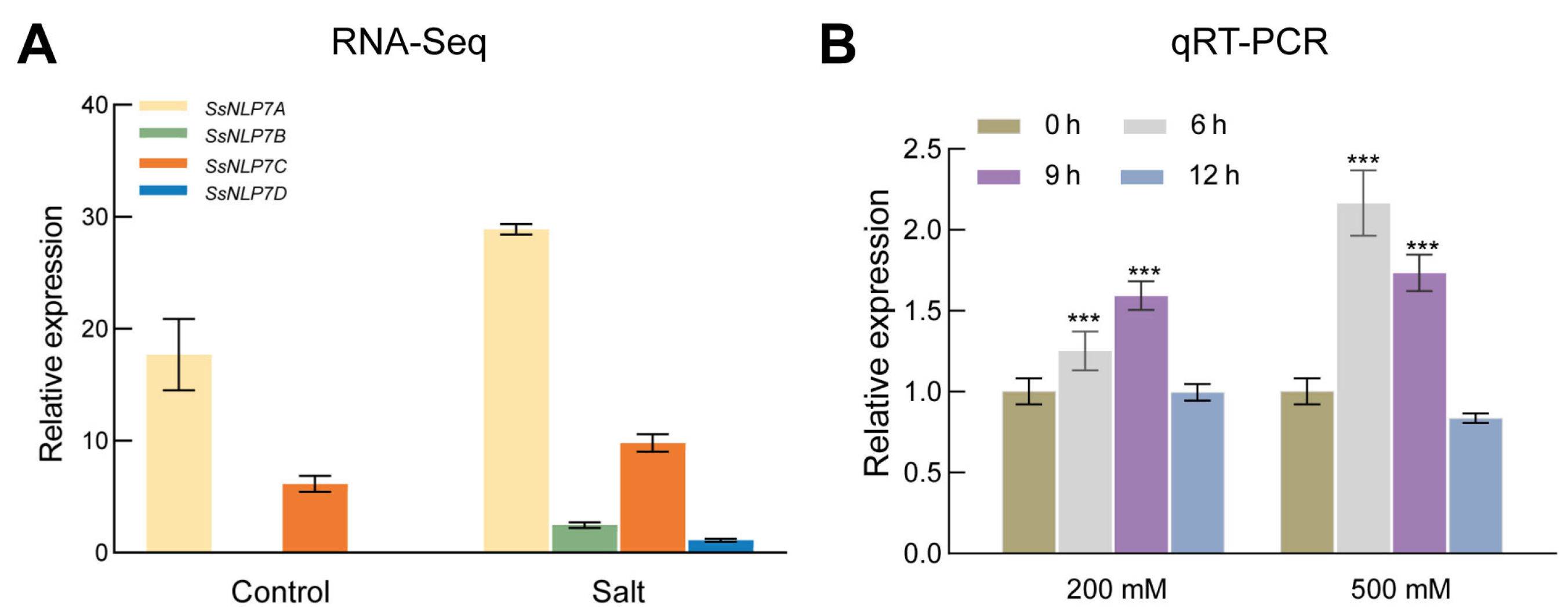 2.2. Relative Expression Level of SsNLP7A in Suaeda salsa