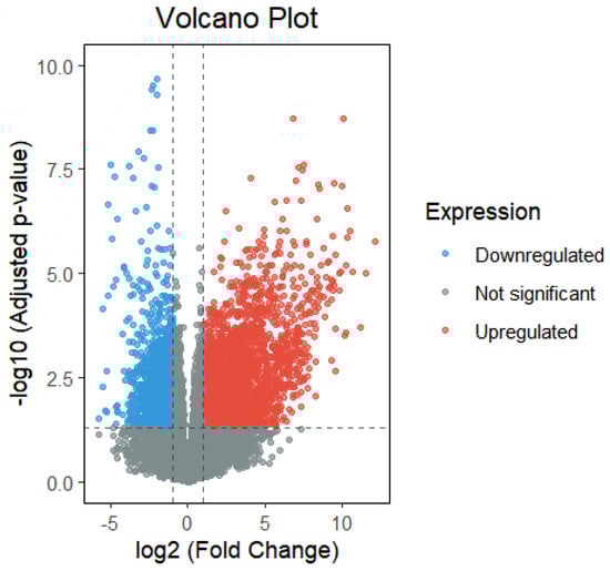Differential expression analysis was conducted in R using the DESeq2 package. Gene names and expression values were extracted from the raw data, filtered to remove null and zero entries, and then grouped by infection status (infected vs. uninfected) and sampling time [35]. Genes with p < 0.05 and |log2FoldChange| > 2 were identified as significantly differentially expressed. This analysis yielded 2459 upregulated and 1428 downregulated genes, as shown in Figure 1 [36].