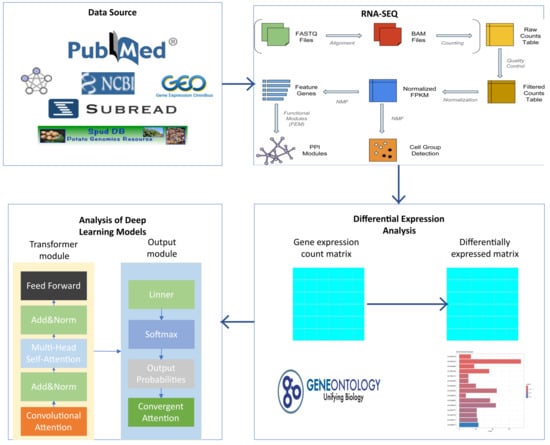 Integrated workflow combining traditional bioinformatics and deep learning approaches for gene expression data analysis. The entire pipeline consists of four major stages: 1. Data Source Acquisition of raw sequencing data from public repositories (e.g., NCBI GEO, PubMed). 2. RNA-SEQ Sequence alignment to the reference genome using alignment tools such as Subread (here, the Solanum tuberosum-specific Spud DB database was used), producing BAM files and raw gene expression counts. These counts undergo quality control, filtering, and normalization (e.g., conversion to FPKM values) to generate a high-quality gene expression matrix that serves as the foundation for downstream analyses. 3. Differential Expression Analysis Statistical analysis of the normalized expression matrix to identify genes with significantly altered expression between different conditions (e.g., infected vs. control). Differentially expressed genes (DEGs) are then mapped to functional annotation databases such as Gene Ontology (GO). Enrichment analysis is performed to identify overrepresented biological processes, molecular functions, or cellular components. The bar plot on the right illustrates a typical visualization of enrichment analysis results, highlighting the most significantly enriched GO terms. 4. Analysis of Deep Learning Models Simplified schematic of the proposed model presented in this study, illustrating the Transformer encoder component with hybrid attention mechanism improvements.