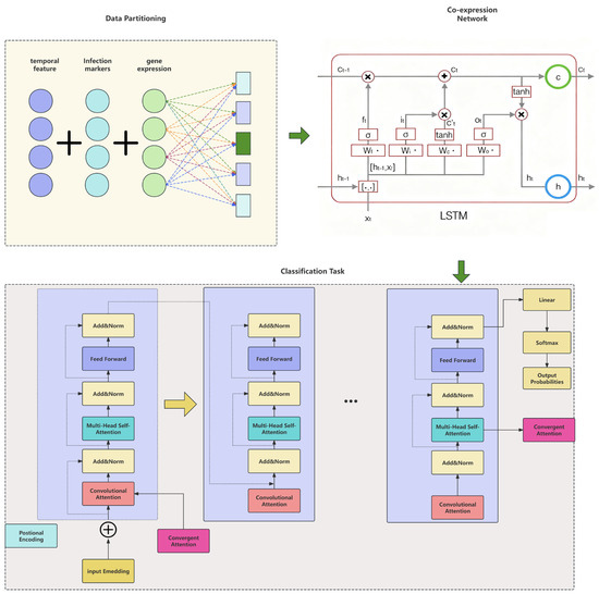 Hybrid LSTM–Transformer architecture for gene expression analysis. The model integrates multiple biological features and processes through a hybrid LSTM–Transformer framework: (1) Data Partitioning: temporal features, infection markers, and gene expression data are preprocessed and partitioned for model input. (2) LSTM Co-expression Network: the LSTM layer captures time-series dependencies, using gates (ft, it, ot, Ct) to extract temporal patterns from gene expression data. (3) Hybrid-attention Transformer encoder: The attention mechanism consists of two types of attention layers: convolutional attention (red blocks) scans for local co-expression patterns within gene clusters; Multi-Head Self-Attention (teal blocks) models global gene interactions across the entire sequence, capturing long-range regulatory dependencies. Each attention layer is followed by Add & Norm operations, which facilitate serial hybrid fusion. This ensures that the output from the convolutional attention layer is normalized and added sequentially into the self-attention layer, effectively combining local and global gene dependencies. (4) Classification Task: The final encoded features are fed into a linear classifier and softmax function for infection status prediction. The attention weights are also aggregated to generate a ranked list of genes based on their contribution to the classification. Note: The colors of each component in the figure are for visual distinction only and have no specific data meaning.