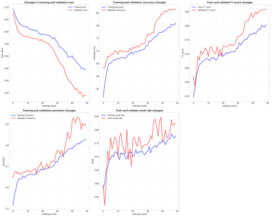The line graph illustrates the loss function, training, and validation accuracy, precision, recall, and F1 score during the model’s training process. The histogram displays the distribution of all weight parameters in the model.
