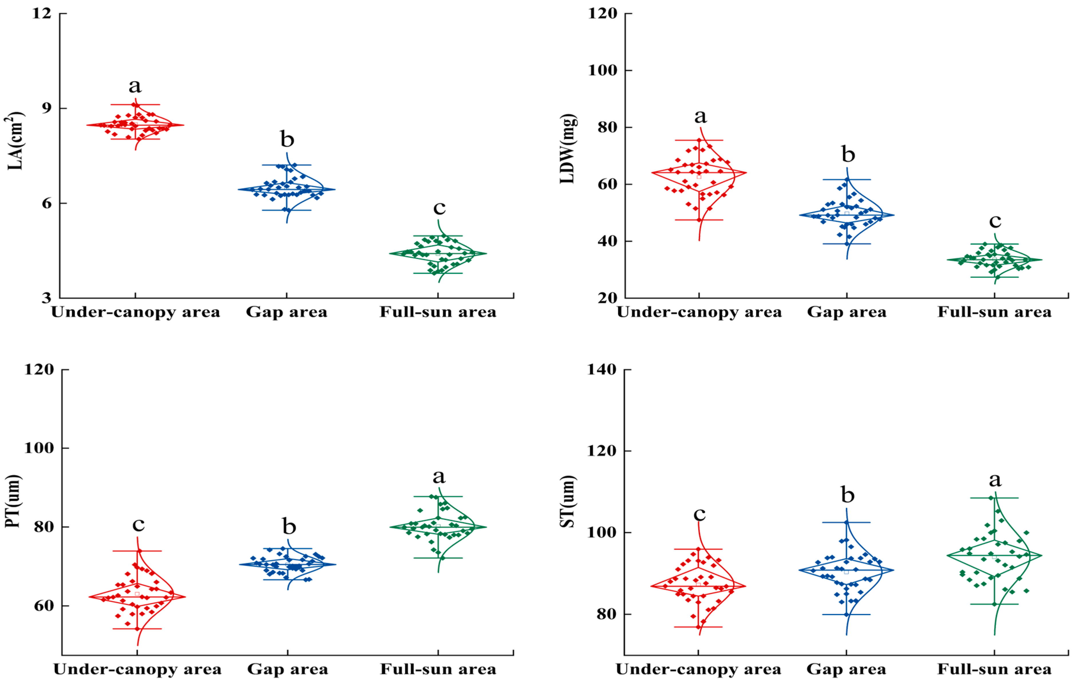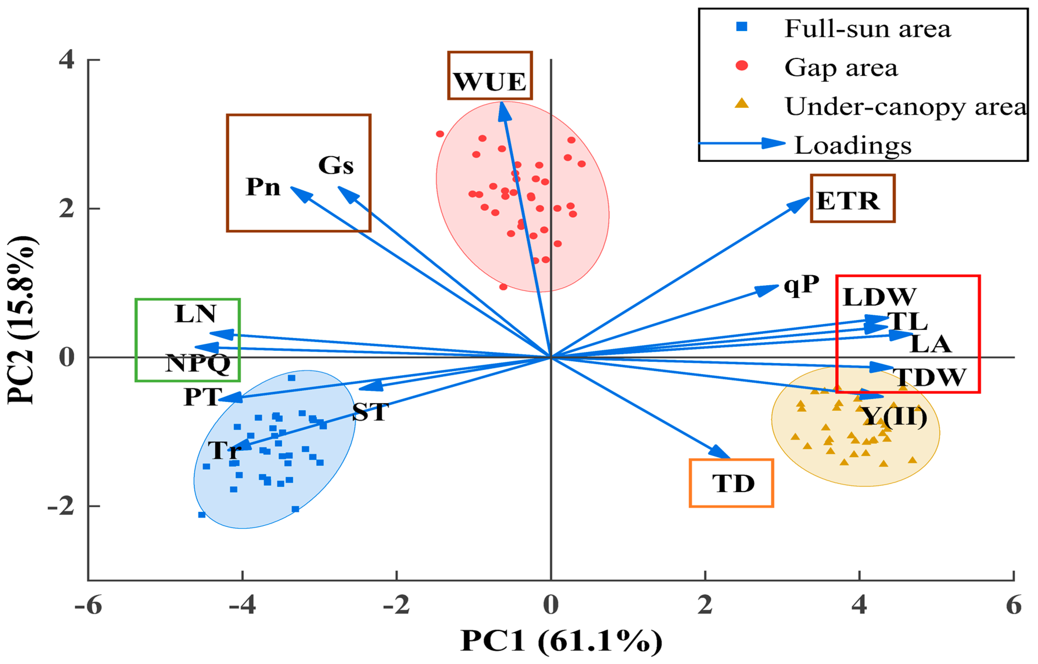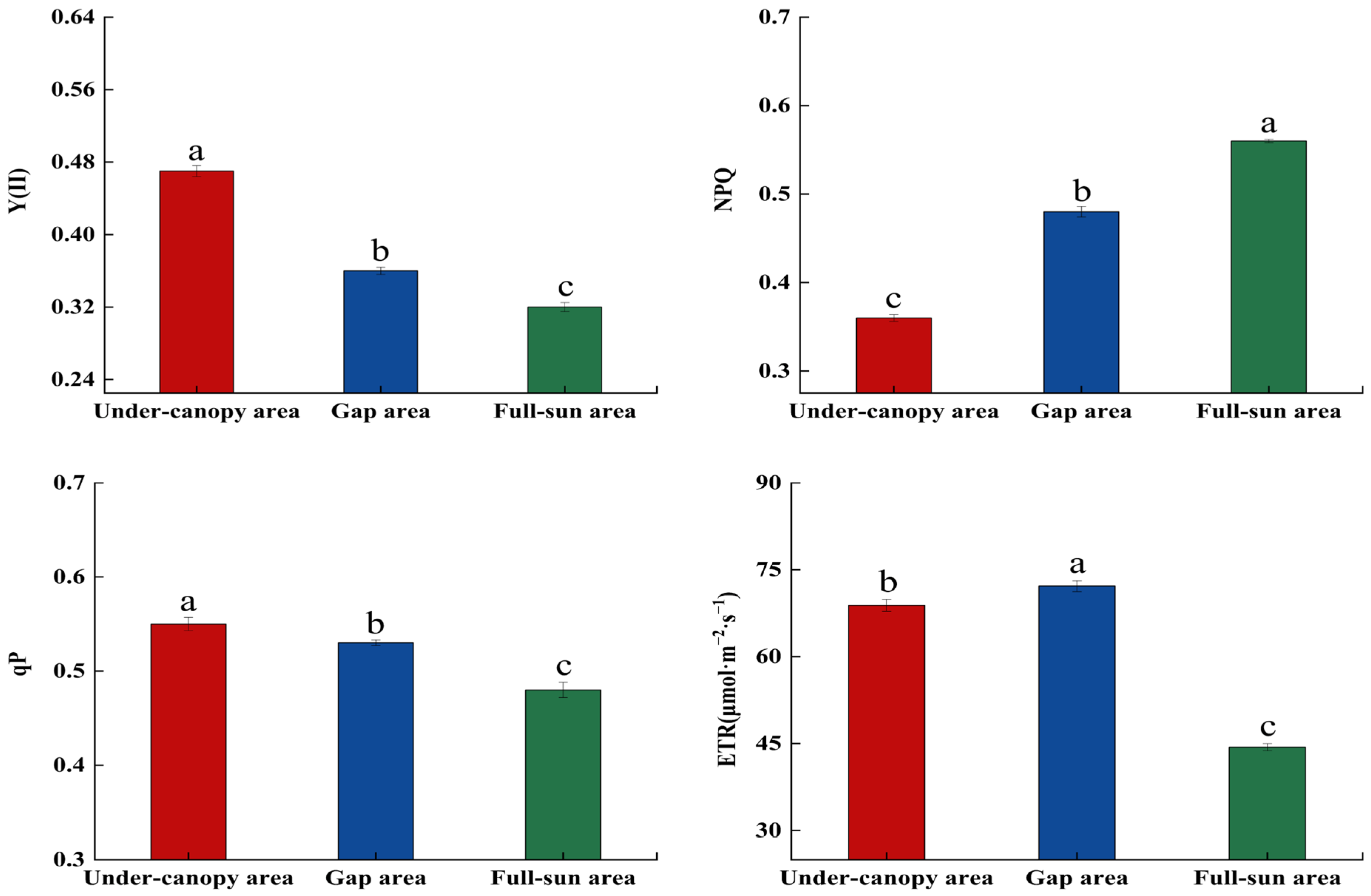 | Full-sun area | 1224.63 ± 10.87 a | 14.34 ± 0.18 c | 25.47 ± 0.37 a | 50.54 ± 0.61 c | 98.56 ± 1.18 c | 0.53 ± 0.078 c |