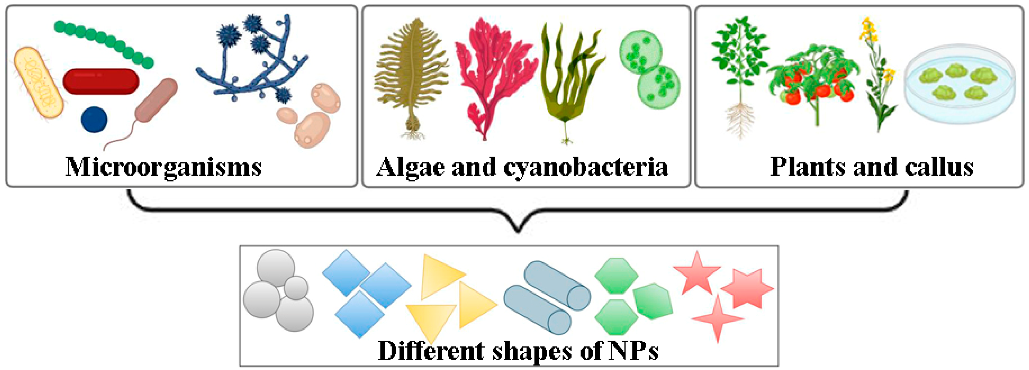 - Hamida, R.S.; Ali, M.A.; Abdelmeguid, N.E.; Al-Zaban, M.I.; Baz, L.; Bin-Meferij, M.M. Cyanobacteria–a promising platform in green nanotechnology: A review on nanoparticles fabrication and their prospective applications. Int. J. Nanomed. 2020, 15, 6033–6066. [Google Scholar] [CrossRef]
