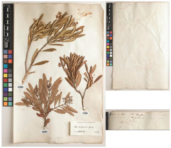 On the other hand, Lowe (1838) [90] clearly indicated that a specimen in the Herb. Banks is very similar to O. glabella Banks ex Lowe (noted above) or O. exasperata Jacq., and this is relevant because there is a sheet of O. exasperata (which is a strictly South African taxon) from Herb. Banks on which Masson’s gathering from the Cape of Good Hope (from Madeira) (BM010763788) is mixed with two other collections from the Cape region by Hermann (BM010763789) and Nelson (BM010763790) (see Figure 2). However, this material belongs to a different species and therefore cannot be considered original for the name Olea europaea var. maderensis.