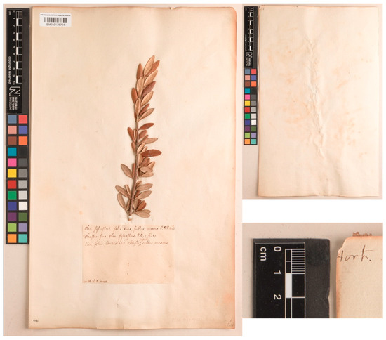 There is another relevant specimen in the Sloane Herbarium (kept separate from our main collection) which was cultivated by Miller at Chelsea Physic Garden in the 1730s and which Miller annotated with the same polynomial by Bauhin (i.e., “4 Olea Sylvestris folio duro subtus incano; C.B.”) as that he later cited in the synonymy of his Olea sylvestris. This specimen (H.S. 228 fol. 79.4), however, belongs to a completely different taxon, i.e., Elaeagnus angustifolia L. (Figure 9) [94]. This species, native to Central Asia, is sometimes confused with wild olives, as one of its common name, ‘Russian Olive’ implies. Miller described it as Olea No. 6 in the earlier editions of the Dictionary [107,108,109], but it was not included in the 8th edition in 1768 [101]. This specimen should therefore not be treated as original material for Olea sylvestris, but it is interesting to see that Miller was also tricked by its morphological appearance in ascribing it to the Olive genus at the beginning of his career.Regarding the material in the Sloane herbarium (H.S. 228 fol. 79.4; see Figure 9), according to Sloane (1707: 14) [110] “Oleastri Species ut quídam putant, au alii Ziziphus alba. Gesn. hort. Germ. fol. 269” is “one of the plants I gathered, or saw in the fields [in Madeira]” [Note: it seems Sloane had seen Oleaster in Madeira, but the H.S. 228 fol. 79.4 specimen was cultivated by Miller at Chelsea in the late 1720s or early 1730s]. In Madeira, E. angustifolia is not naturalized, and it is rarely cultivated [111], nor was it recorded for the archipelago by Lowe (1857–1868, 1872) [91,93,112]. Harcourt (1851: 137) [113] records this as E. angustifolia, a species found naturalized only in some areas of the island of Porto Santo [114,115]. According to Menezes de Sequeira et al. [111], it seems more likely that Sloane was referring to O. maderensis, a taxon that has narrower and more whitish leaves than the European species of Olea. However, the material preserved in the Sloane herbarium is undoubtedly a specimen of E. angustifolia as subsequently published by Santos-Guerra et al. (2020: 183) [94].