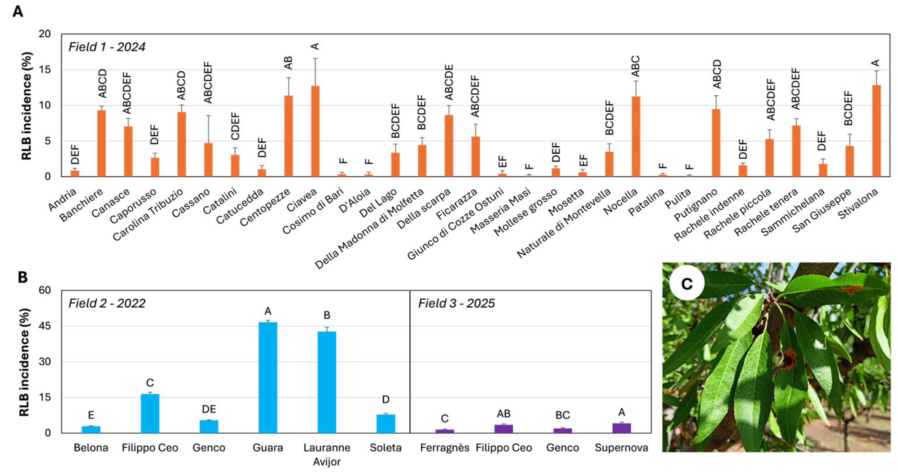 In 2024, RLB symptoms were more prevalent, enabling statistical comparisons among cultivars. ‘Stivalona’ and ‘Ciavea’ showed the highest incidence (12.8% and 12.7%, respectively), differing significantly from all other cultivars. ‘Centopezze’, ‘Nocella’, ‘Putignano’, ‘Banchiere’, ‘Carolina Tribuzio’, ‘Della Scarpa’, ‘Rachele tenera’, and ‘Canasce’ showed incidences between 11.4% and 7.1%. Conversely, ‘Catucedda’, ‘Cosimo di Bari’, ‘D’Aloia’, ‘Giunco di Cozze’, ‘Ostuni’, ‘Masseria Masi’, ‘Mollese grosso’, ‘Mosetta’, ‘Patalina’, and ‘Pulita’ exhibited incidences below 2%. Intermediate responses were recorded in the remaining cultivars (
