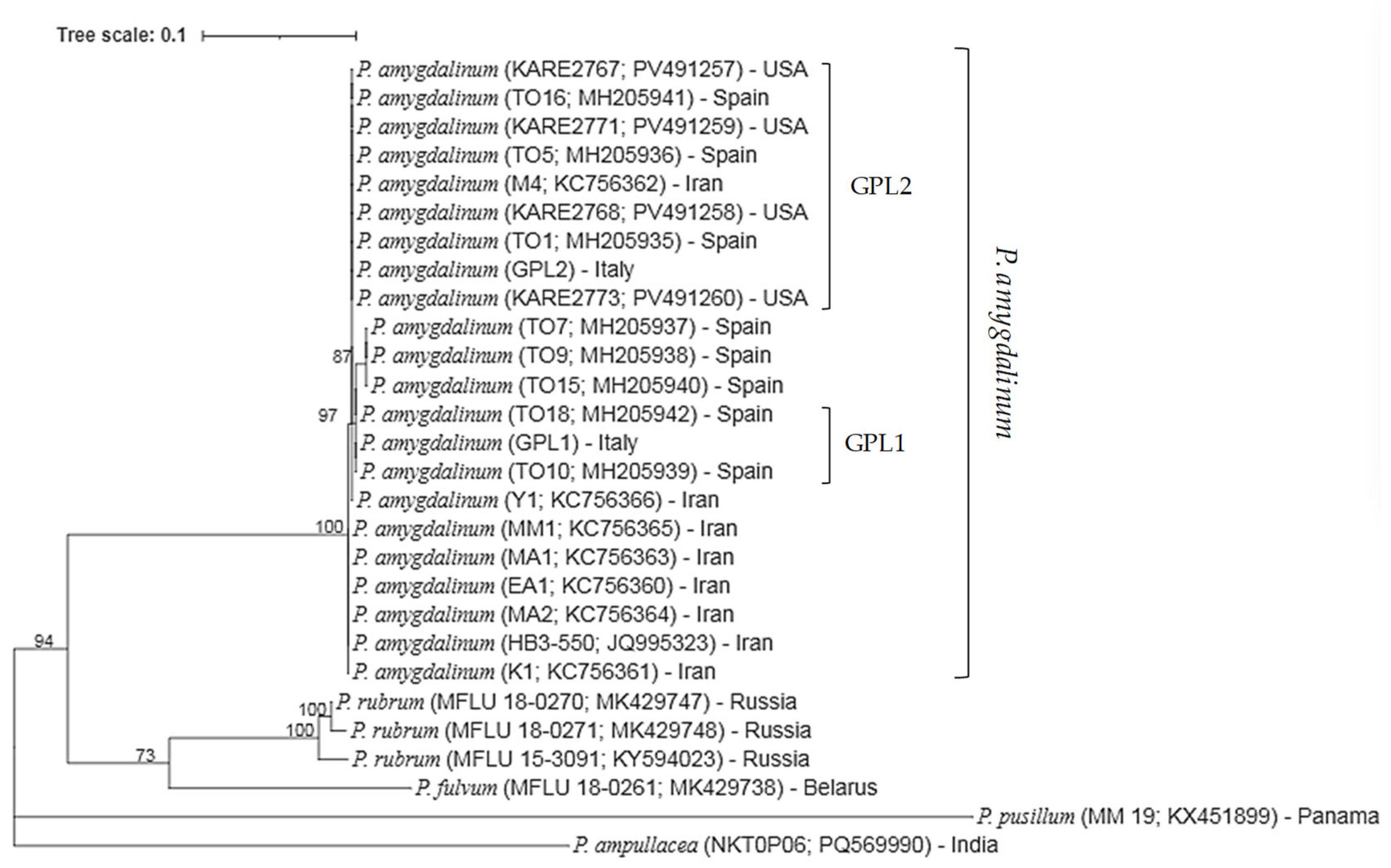 P. amygdalinum. All reference and newly generated sequences clustered within a single, well-supported clade, with a bootstrap value of 100%. Isolate GPL1 (obtained from cv. ‘Guara’, exhibiting early RLB symptoms) grouped with reference isolates TO10 and TO18 with 97% bootstrap support, whereas isolate GPL2 (from cv. ‘Lauranne