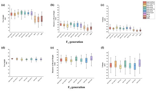 The subsequent analysis of data distribution, presented in Figure 1, revealed that F1 data exhibited superior central tendency, dispersion, outlier control, and distribution shape, alongside significantly higher stability compared to the F2 data. Nevertheless, among the F2 hybrid larch families, data stability was found to be higher in hybrid families than in control families. Specifically, the LK5 × LG9 and LK12 × LG9 families demonstrated high stability across generations, indicating robust genetic stability. In terms of breast height diameter and volume, the F2 data outperformed the F1 data in central tendency, dispersion, outlier control, and distribution shape. A statistically significant increase in data stability was observed between the F2 and F1 groups.