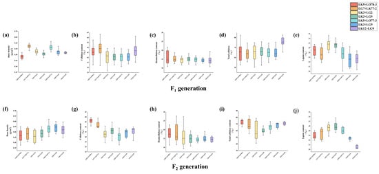 Regarding fiber length, the LG7 × LK77-2 family exhibited the best performance among the seven F1 families, significantly surpassing most others. In contrast, LK5 × LO78-3 performed the least favorably, falling significantly below the median of the other families. In the F2 generation, LK3 × LG2 demonstrated the highest performance, with a marked improvement over the other six families. For fiber width, LK3 × LG2 showed the best performance among the seven F1 families, significantly exceeding several other families. Conversely, LK5 × LO78-3 exhibited the poorest performance, with significant differences observed compared to the majority of families. In the F2 generation, the LK3 × LG2 family had a significantly higher fiber width compared to the remaining six families, though no significant differences were found among the latter. Regarding the fiber length-to-width ratio, the differences among the seven families in both the F1 and F2 generations did not reach statistical significance.
