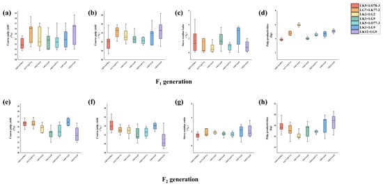 Figure 4 presents the distribution analysis of pulping performance traits for the F1 and F2 generations across the seven families. The F1 generation exhibited superior overall performance in terms of central tendency, dispersion, outlier control, and distribution shape for coarse pulp yield, fine pulp yield, and screen residue rate when compared to the F2 generation. Data stability in the F2 generation showed a declining trend, indicating increased dispersion and trait segregation. However, within the F2 generation, the LK3 × LG2 and LK12 × LG9 families demonstrated upward trends in coarse pulp yield, fine pulp yield, and screen residue rate compared to the F1 generation. Figure 4 illustrates the distribution of pulp productivity trait data for the F1 and F2 generations of the seven families. A comparison between the two generations revealed that the F2 generation exhibited significantly improved stability in the pulp productivity traits. This was evidenced by an upward shift in median values, narrower data distribution ranges, fewer outliers, and a stronger concentration of high values, demonstrating enhanced genetic stability across families.