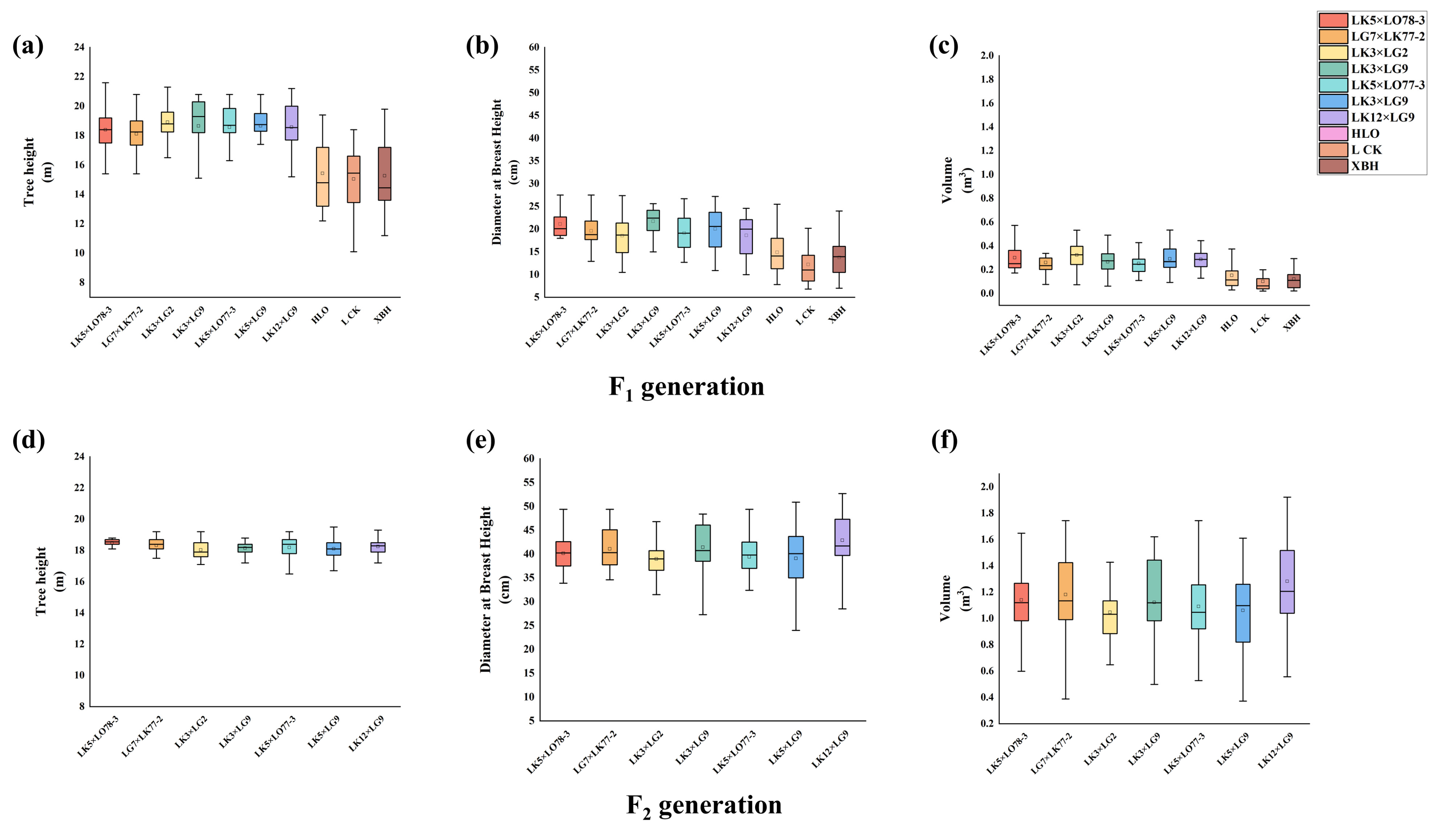 - Zhang, H.G.; Zhang, C.L.; Lan, S.B.; Kang, Y.K.; Pan, B.L. Heterosis analysis and family selection of larch (Larix spp.). J. Nanjing For. Univ. (Nat. Sci. Ed.) 2005, 29, 69–72. [Google Scholar] [CrossRef]
