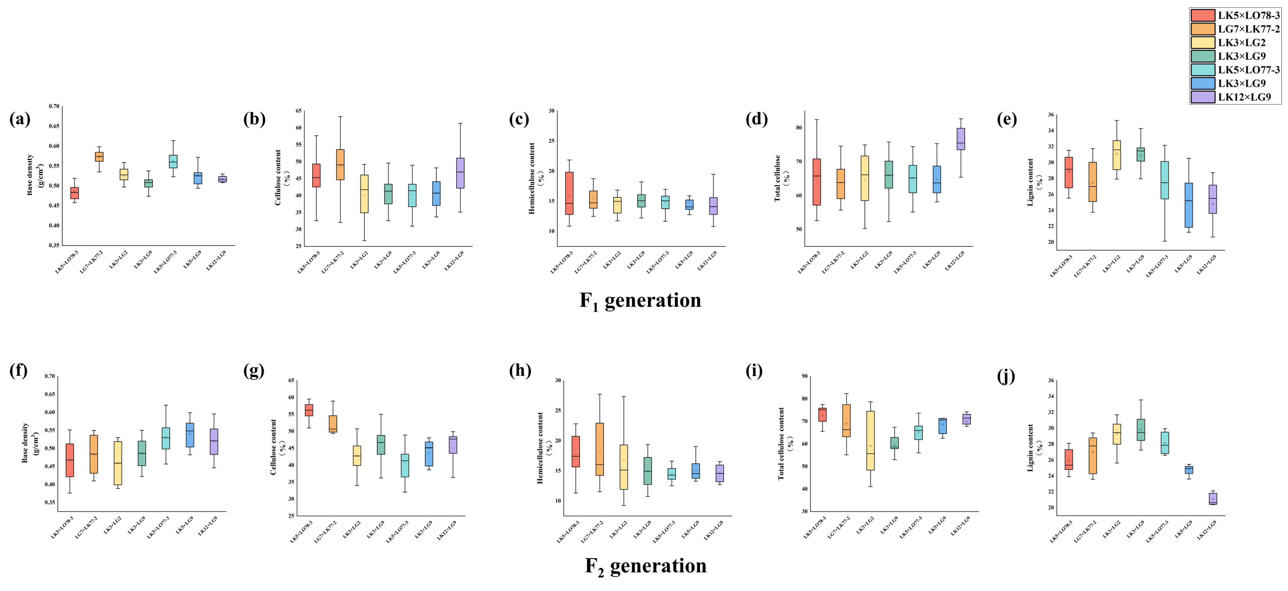 2.2. Comparison of Wood Property Traits Between F1 and F2 Generations