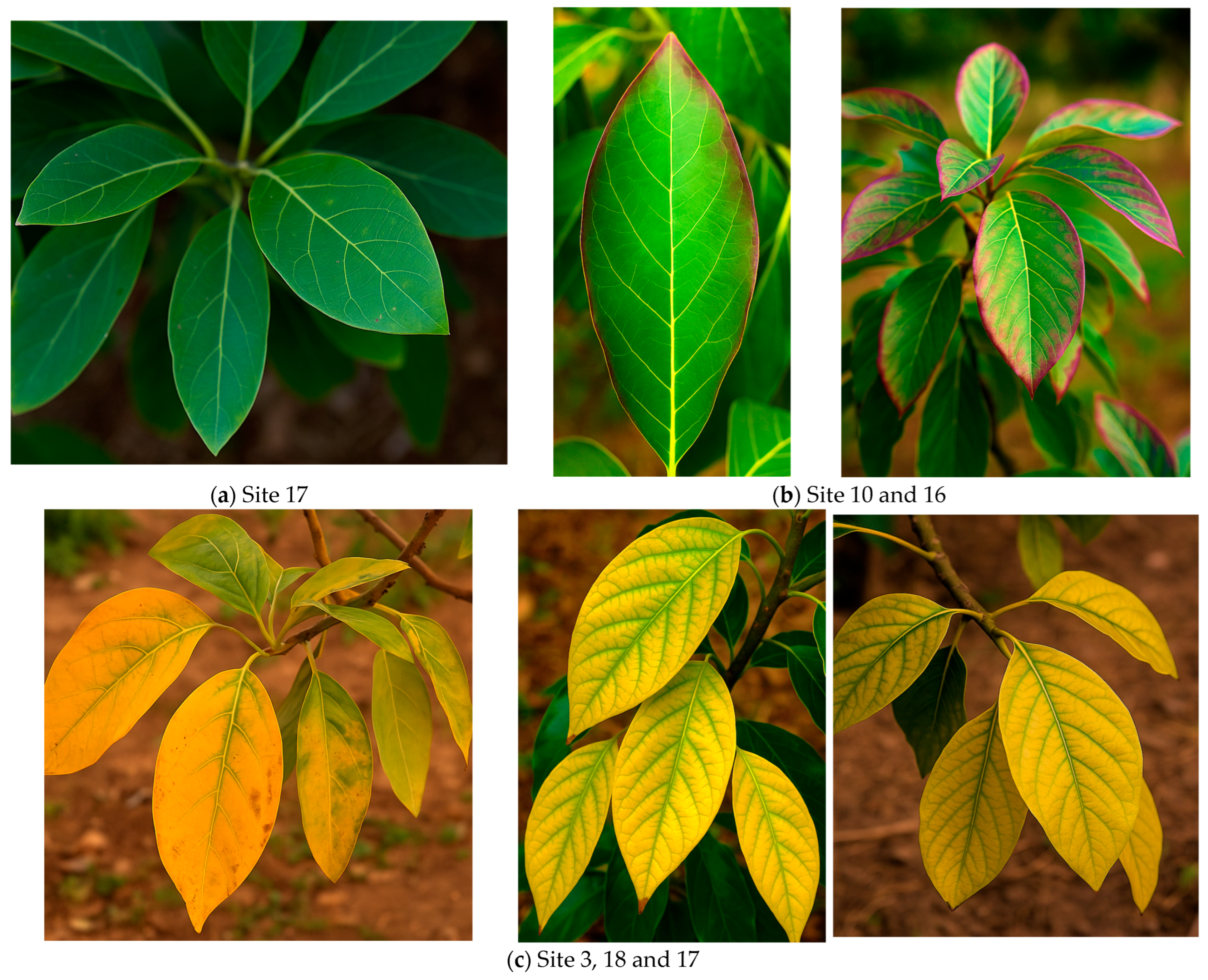 3.1. Leaf Nutritional Status, Photosynthetic Pigments, and HM Accumulation in Relation to Soil Quality and Farming Practices in Avocado Orchard