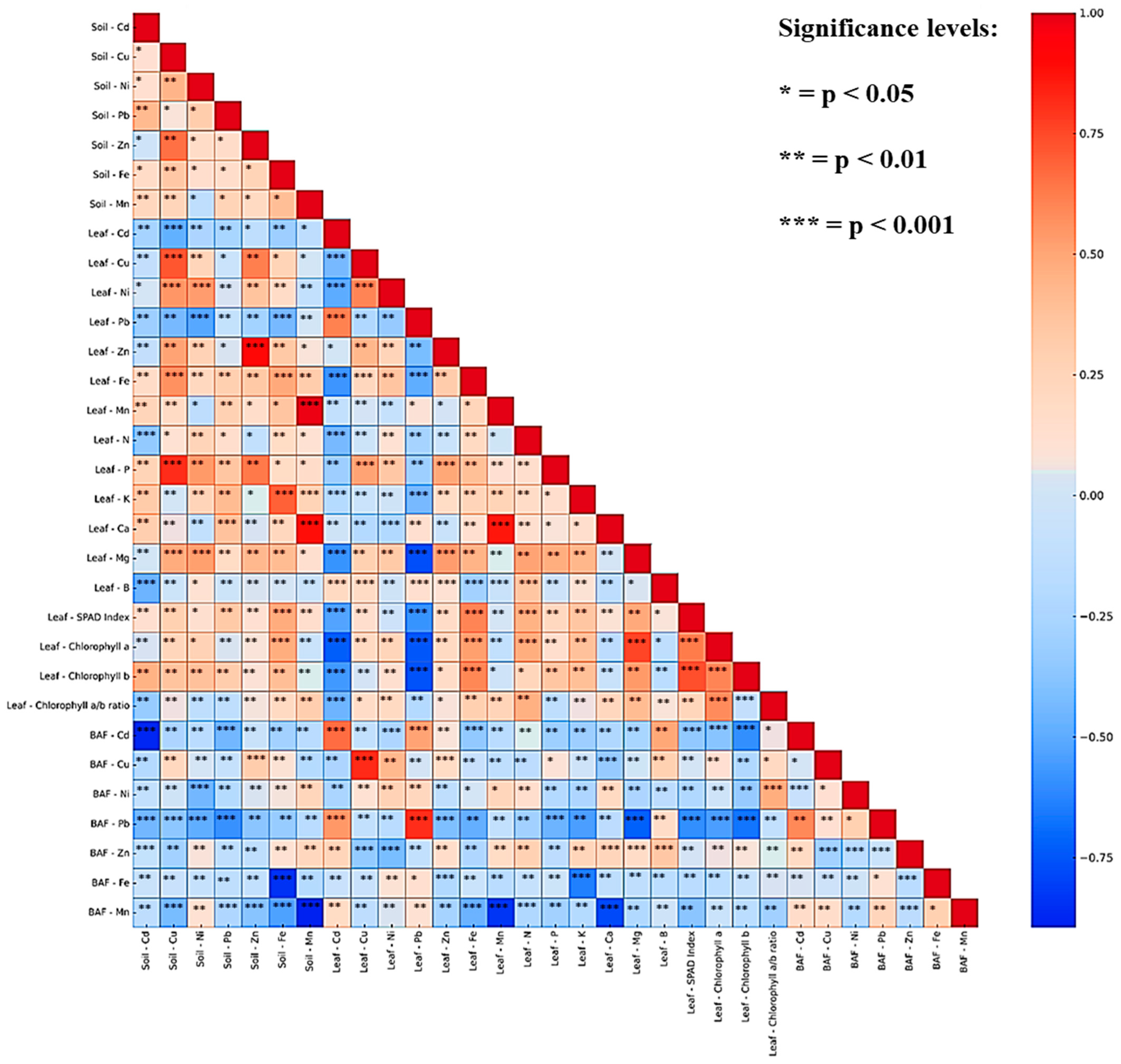 3.3. Interrelationships Among Soil Properties, Leaf Nutritional Status, HM Accumulation, and BAF in Avocado Orchards