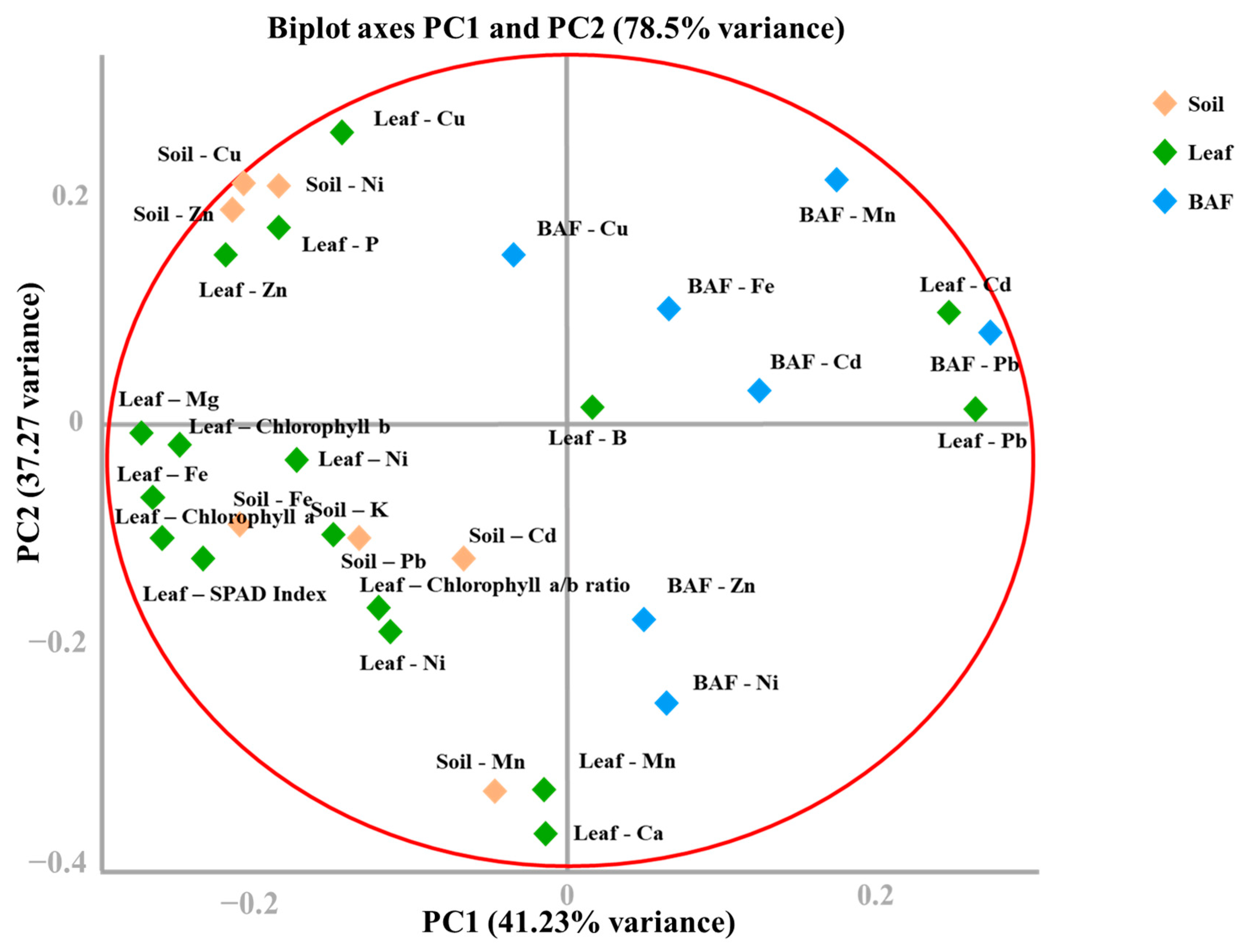 3.3.2. PCA of Soil, Leaf, BAF and Photosynthetic Parameters