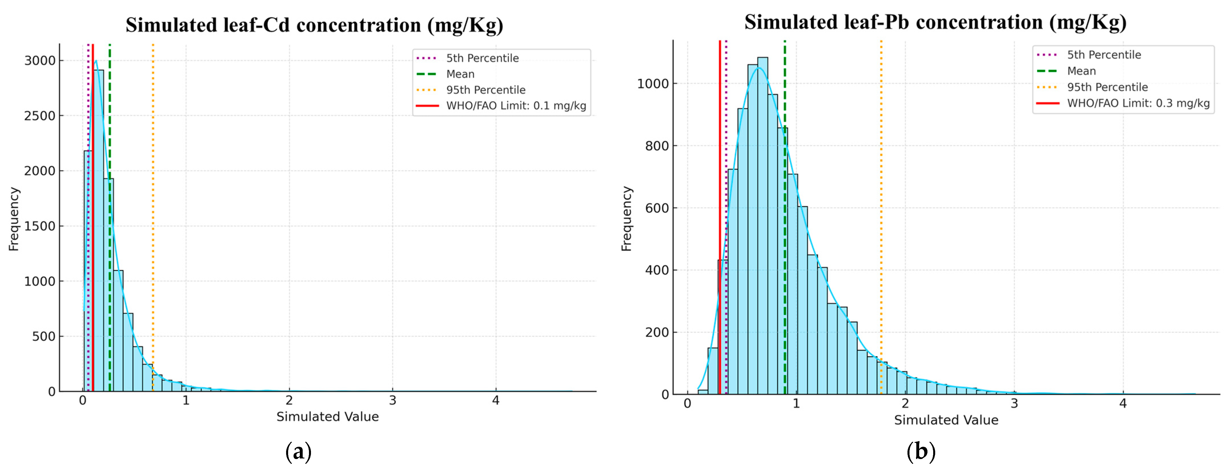 - Sanad, H.; Moussadek, R.; Mouhir, L.; Lhaj, M.O.; Dakak, H.; Manhou, K.; Zouahri, A. Monte Carlo Simulation for Evaluating Spatial Dynamics of Toxic Metals and Potential Health Hazards in Sebou Basin Surface Water. Sci. Rep. 2025, 15, 29471. [Google Scholar] [CrossRef]