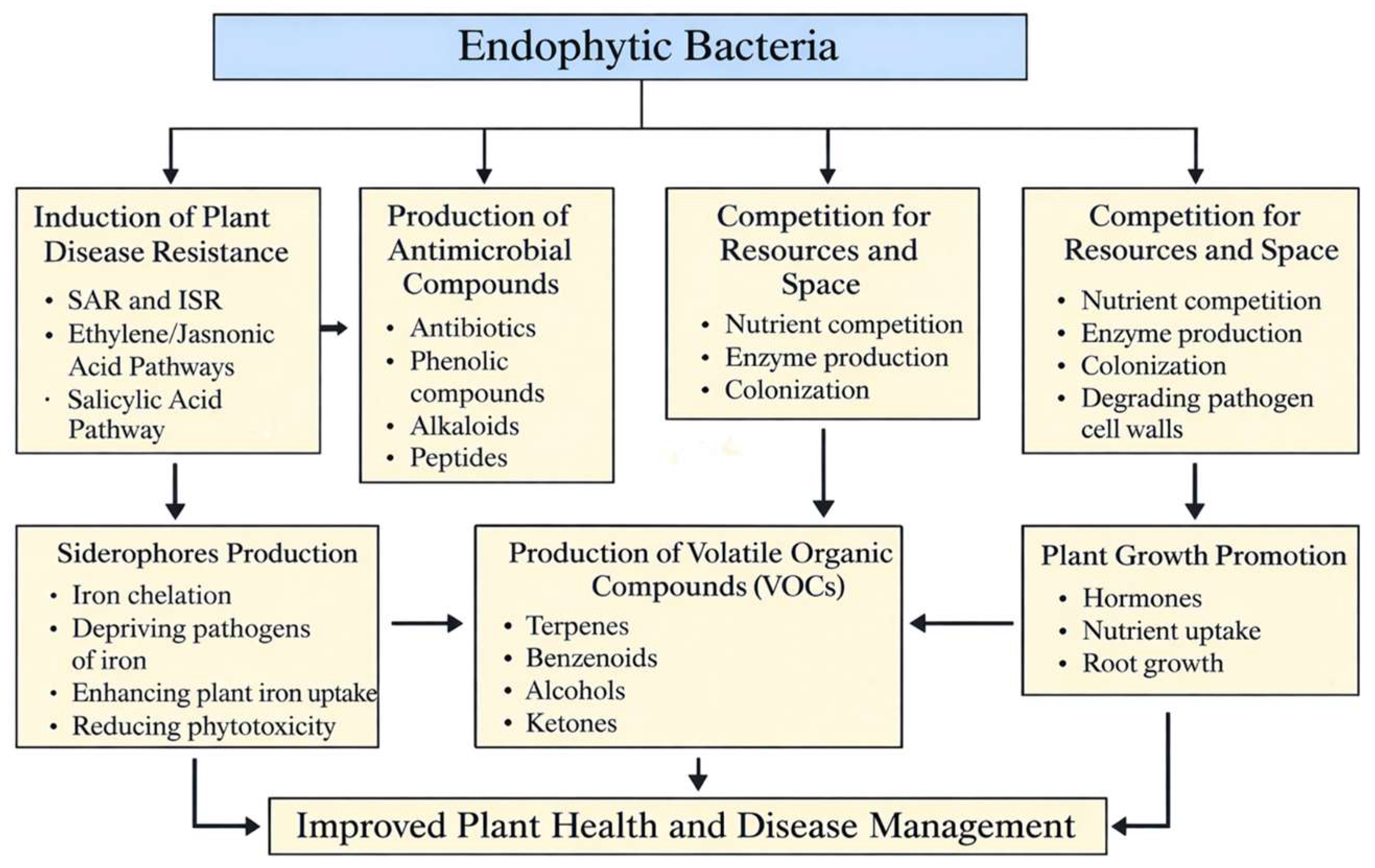 - Bacillus: The genus Bacillus comprises some of the most well-characterized endophytic bacteria, owing to their remarkable ability to form endospores. This attribute allows them to withstand extreme conditions, including drought, salinity, heat, and nutrient limitation. Bacillus spp. plays a crucial role in enhancing plant stress tolerance by producing phytohormones, osmoprotectants, and exopolysaccharides, which collectively promote root development and improve plant water retention in challenging environments [19].