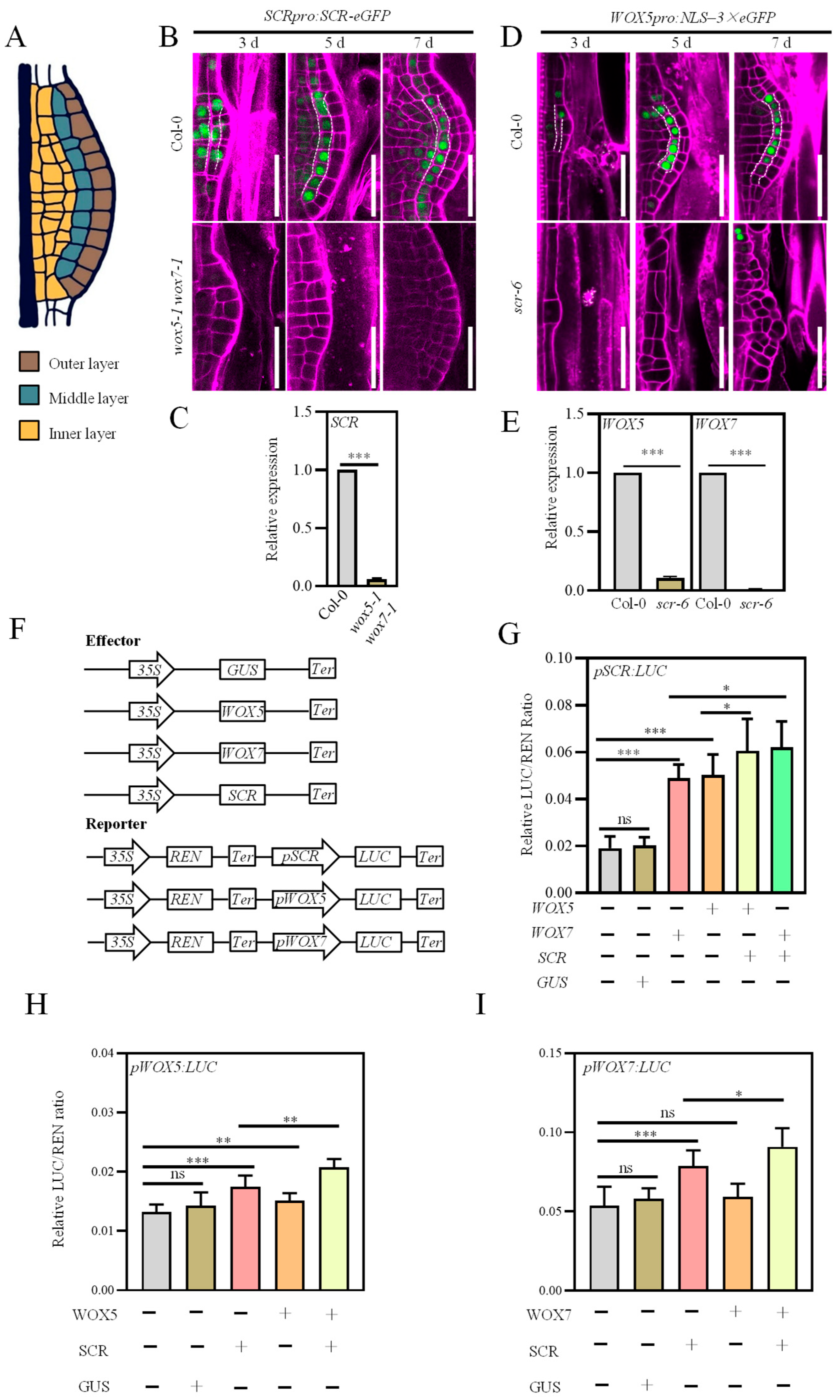 3.1. Mutual Transcriptional Regulation Between WOX5/7 and SCR
