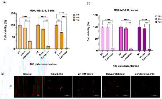 Comparative effects of S-Mix, Vacrol, and carvacrol on MDA-MB-231 cell viability and PI positivity: (a,b) The effect of 100 μM S-Mix, Vacrol, and Carvacrol treatment on cell viability in the MDA-MB-231 cell line for 24, 48, and 72 h. Data are presented as mean ± SD of 3 biological and 6 technical replicates (n = 3). Significant differences are indicated by asterisks (**** p < 0.0001; Kruskal–Wallis followed by Dunn’s multiple-comparison test). (c) Fluorescence microscopy analysis of cell viability loss following S-Mix, Vacrol, and Carvacrol treatment for 72 h in MDA-MB-231 cells. After treatment for 72 h, cells were stained with 1 µg/mL PI for 30 min, and the cells were then imaged using fluorescence microscopy (Ex./Em.:493/635 nm). Red fluorescence indicates PI-positive (dead) cells. Scale bar 200 μm.