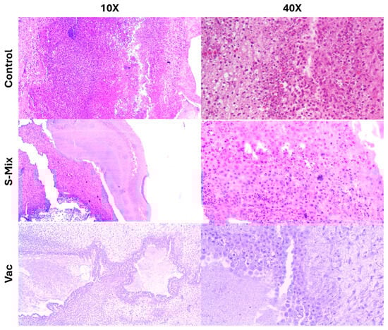 Macroscopic tumor volume analysis was performed with ImageJ ver.1.54p software using photographs taken at the start of treatment (t0) and at 72 h (t72). First, the scale in each egg photograph was normalized using a fixed reference point (e.g., a shell fracture line). Then, the length and width of each tumor were measured, scale differences were normalized, and proportional volumes were calculated using the formula: width × length2. For each tumor, the baseline t0 volume was set to 100, and the t72 values were expressed as percentage changes. Inflammatory-cell infiltration appeared more prominent in Vacrol-treated tumors, whereas apoptosis-like morphology (e.g., nuclear condensation/fragmentation) was more frequently observed in S-Mix-treated tumors; however, apoptosis was not quantified in this study. As a result of the analysis, tumor volume in the control group remained approximately stable (~100%), no significant change was observed in the Vacrol group, while in the S-Mix group, tumor volume decreased by about 40% (t0 = 100 → t72 ≈ 60) (Figure 6).