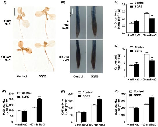 Effect of SQR9-emitted VOCs on ROS accumulation and antioxidant enzyme activities in Arabidopsis. The figure displays the accumulation and content of reactive oxygen species (ROS; H2O2 and O2−) and the activities of antioxidant enzymes in 10-day-old Arabidopsis seedlings co-cultured with SQR9 VOCs or sterile medium (Control), under 0 mM or 100 mM NaCl. (A) Histochemical detection of H2O2 in seedlings (DAB staining). Scale bar: 1 cm. (B) Histochemical detection of O2− in roots (NBT staining). Scale bar: 100 µm. (C) Quantitative analysis of H2O2 content (nmol mg−1 FW). (D) Quantitative analysis of O2− content (nmol g−1 FW). (E) Average peroxidase (POD) activity (Unit g−1 FW). (F) Average catalase (CAT) activity (Unit g−1 FW). (G) Average superoxide dismutase (SOD) activity (Unit g−1 FW). All quantitative data (C) to (G) are presented as mean ± SD. Double asterisks (**) indicate a highly significant difference (p < 0.01) compared to the Control group under the corresponding NaCl concentration.