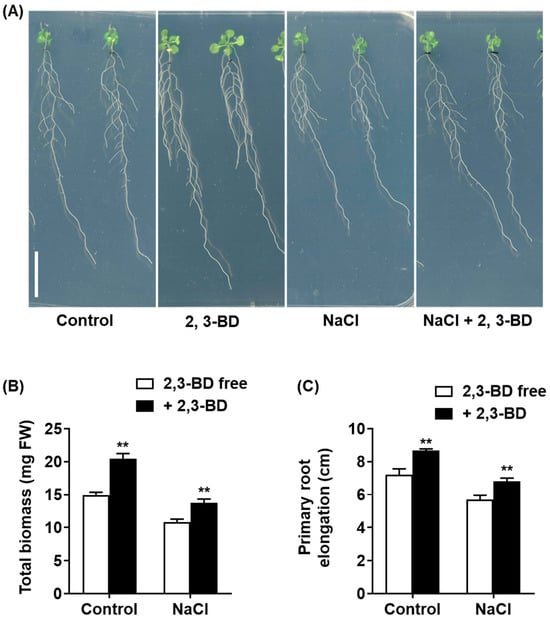 Exogenous application of 2,3-butanediol (2,3-BD) promotes growth in Arabidopsis under non-saline and salt-stressed conditions. The figure displays the effect of synthetic 2,3-BD (100 µM) exposure on 4-day-old Arabidopsis seedlings grown for 10 days on 1/2 MS medium with or without 100 mM NaCl. (A) Phenotypic analysis of seedlings. Scale bar: 1 cm. (B) Average total biomass (mg FW). (C) Average primary root elongation (cm). All quantitative data are presented as mean ± SD. Double asterisks (**) indicate a highly significant difference (p < 0.01) compared to the respective 2,3-BD -free group (Control or NaCl-only treated).
