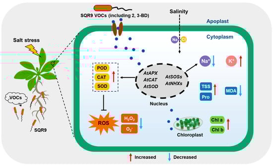 A proposed working model for B. velezensis SQR9-emitted VOCs-mediated salt tolerance in Arabidopsis thaliana. Under salt stress, SQR9 releases volatile organic compounds (VOCs), including the key effector 2,3-butanediol (2,3-BD). Perception of these VOCs triggers a signaling cascade that transcriptionally upregulates ROS-scavenging genes (AtAPX, AtCAT, AtSOD) and ion homeostasis genes (AtSOSs, AtNHXs), while downregulating AtHKT1. This dual regulation enhances antioxidant enzyme activities (POD/CAT/SOD) to detoxify ROS and optimizes ion transport (Na+ efflux/sequestration and K+ retention) to maintain a high K+/Na+ ratio. Consequently, SQR9 VOCs mitigate oxidative damage and protect photosynthetic machinery, promoting plant growth and salt tolerance. Red arrows indicate upregulation or increase; blue arrows indicate downregulation or decrease.